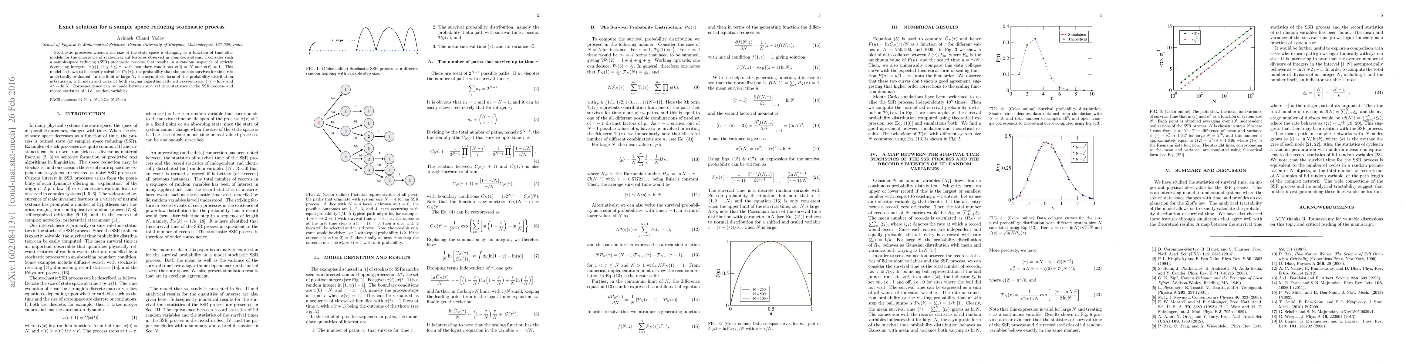 Stochastic processes wherein the size of the state space is changing as a function of time offer models for the emergence of scale-invariant features observed in complex systems. I consider such a sample-space reducing (SSR) stochastic process that results in a random sequence of strictly decreasing integers $\{x(t)\}$, $0\le t \le \tau$, with boundary conditions $x(0) = N$ and $x(\tau)$ = 1. This model is shown to be exactly solvable: $\mathcal{P}_N(\tau)$, the probability that the process survives for time $\tau$ is analytically evaluated. In the limit of large $N$, the asymptotic form of this probability distribution is Gaussian, with mean and variance both varying logarithmically with system size: $\langle \tau \rangle \sim \ln N$ and $\sigma_{\tau}^{2} \sim \ln N$. Correspondence can be made between survival time statistics in the SSR process and record statistics of i.i.d. random variables.