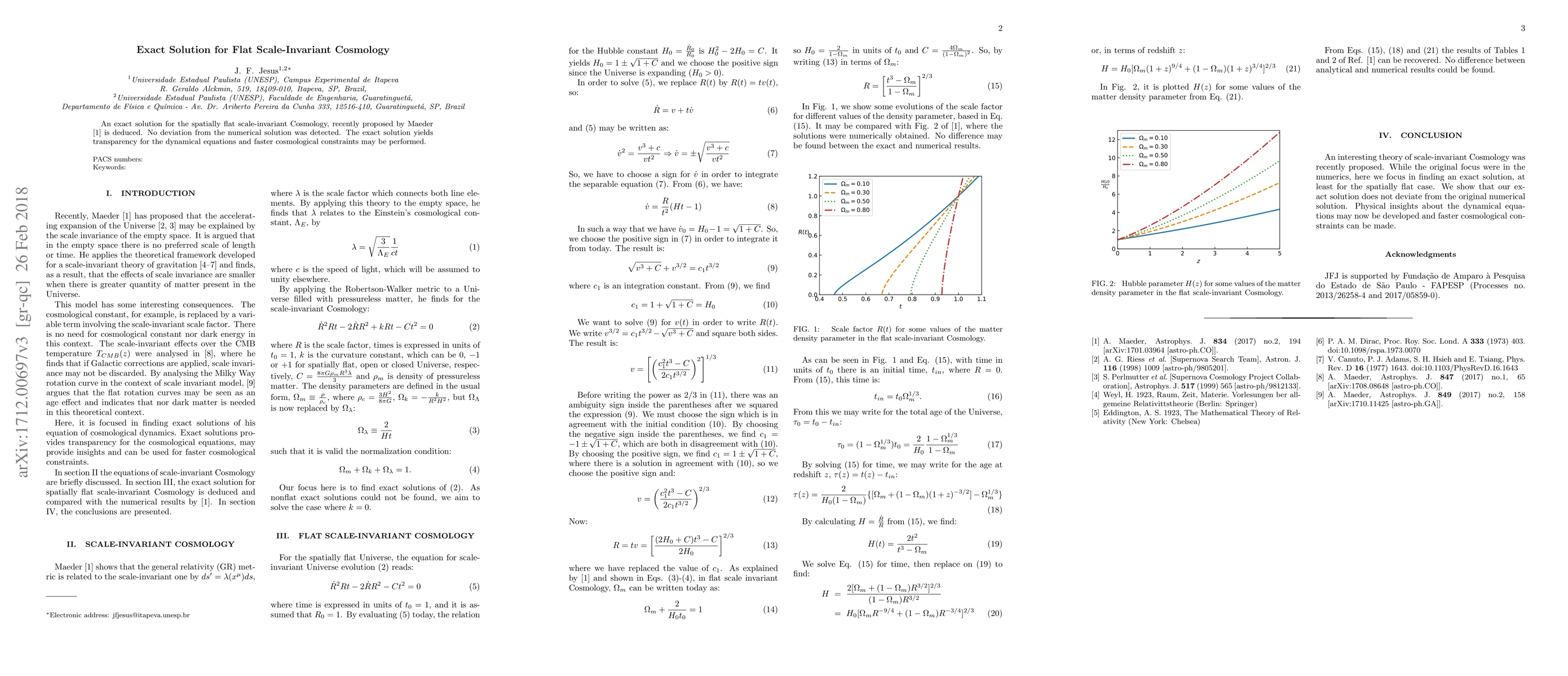 This paper presents an exact solution for spatially flat, scale-invariant cosmology proposed by Maeder, confirming its accuracy against numerical solutions. The exact solution enhances understanding of the dynamical equations and facilitates quicker cosmological constraints.