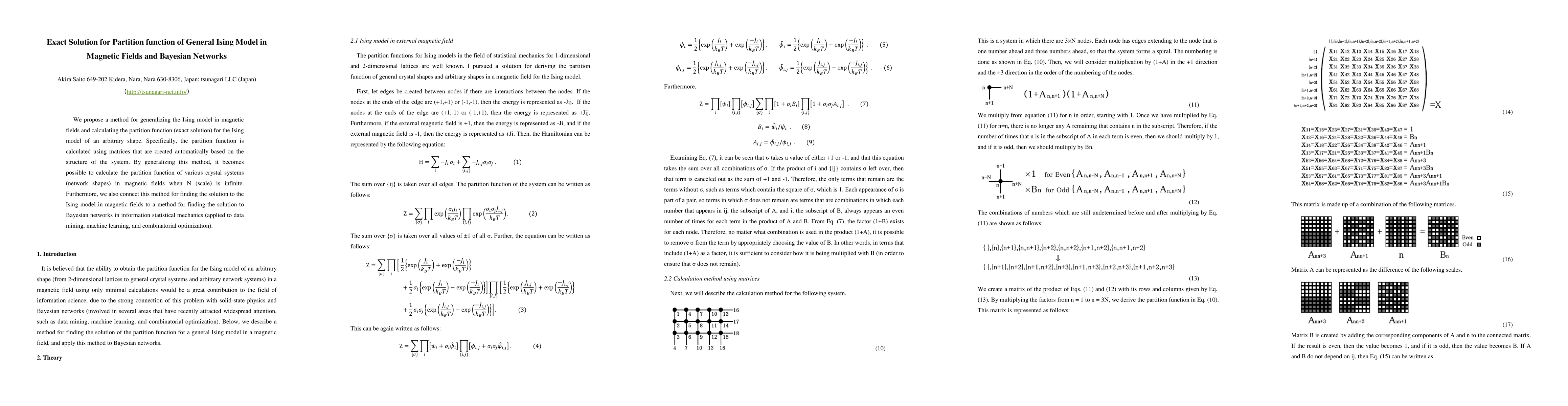 We propose a method for generalizing the Ising model in magnetic fields and calculating the partition function (exact solution) for the Ising model of an arbitrary shape. Specifically, the partition function is calculated using matrices that are created automatically based on the structure of the system. By generalizing this method, it becomes possible to calculate the partition function of various crystal systems (network shapes) in magnetic fields when N (scale) is infinite. Furthermore, we also connect this method for finding the solution to the Ising model in magnetic fields to a method for finding the solution to Bayesian networks in information statistical mechanics (applied to data mining, machine learning, and combinatorial optimization).