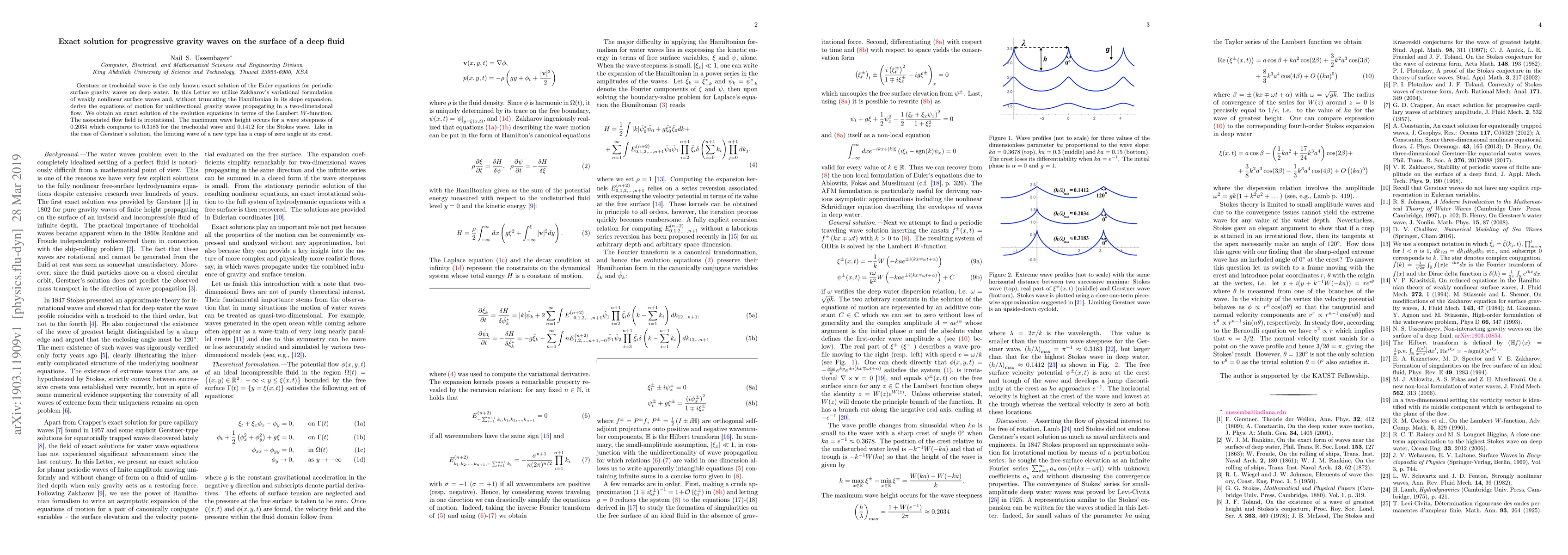 Researchers derived an exact solution for progressive gravity waves on a fluid surface using Zakharov's variational formulation, finding that the maximum wave height occurs at a steepness of 0.2034, comparable to Gerstner's trochoidal wave.