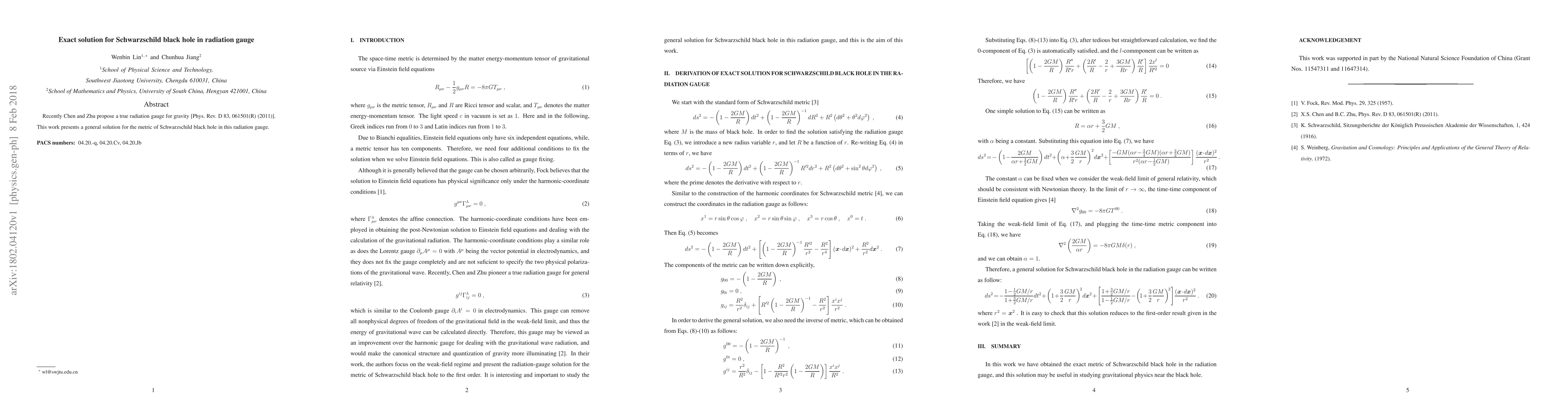 Summary: This paper provides an exact solution for the Schwarzschild black hole metric formulated in the newly proposed radiation gauge by Chen and Zhu, offering a novel perspective on gravitational fields around black holes. The solution elucidates the gauge's implications for understanding black hole spacetime.