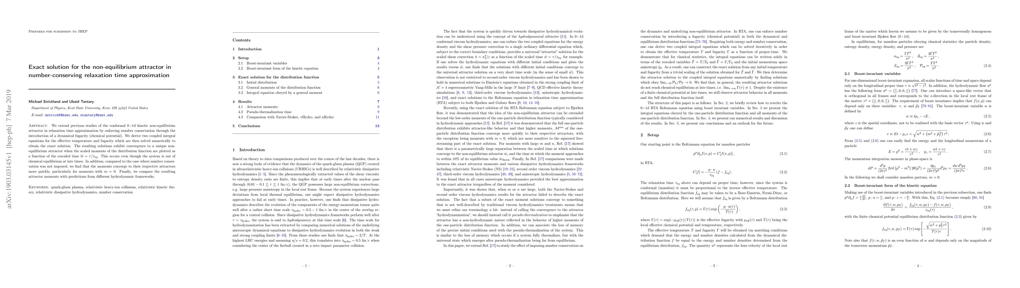 This paper derives exact solutions for a non-equilibrium attractor in a number-conserving relaxation time approximation, solving coupled integral equations for effective temperature and fugacity. The solutions show faster convergence to a unique attractor, especially for moments with m=0, compared to non-conserving cases.