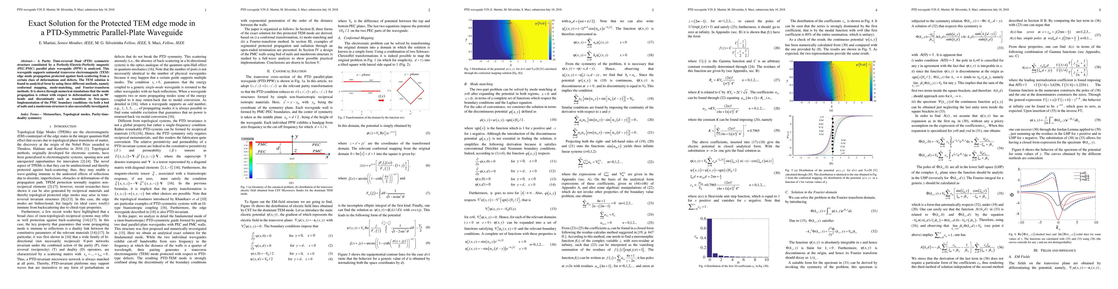The paper provides an exact analytical solution for a protected TEM edge mode in a PTD-symmetric parallel-plate waveguide using conformal mapping, mode-matching, and Fourier-transform methods. Numerical simulations demonstrate the robustness of the mode against deformations and discontinuities, and PMC boundary conditions are implemented via bed of nails and mushroom structures.
