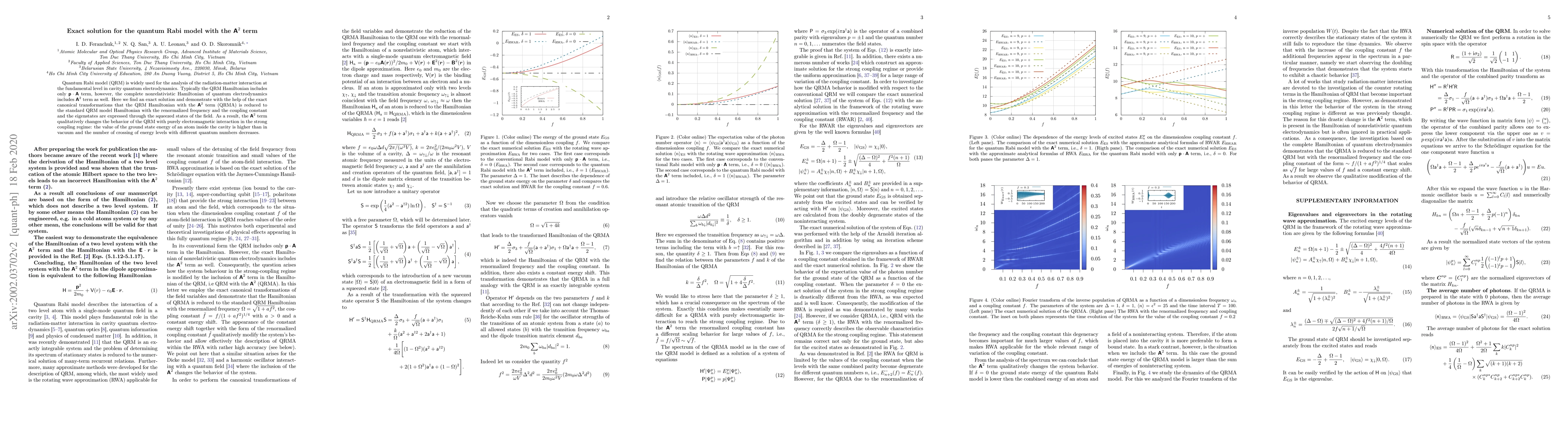 Researchers found an exact solution for the quantum Rabi model with the A^2 term, showing that it changes the behavior of radiation-matter interaction at strong coupling regimes, increasing ground state energy and reducing energy level crossings.