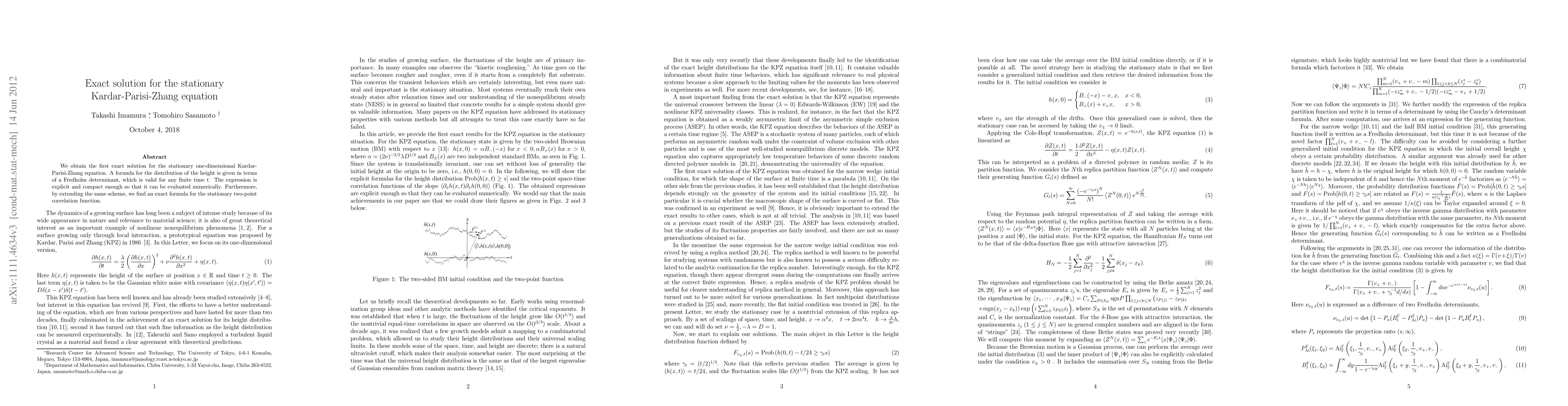 This paper presents the first exact solution for the stationary one-dimensional Kardar-Parisi-Zhang equation, providing a Fredholm determinant formula for the height distribution and an exact expression for the two-point correlation function, both valid for any finite time.