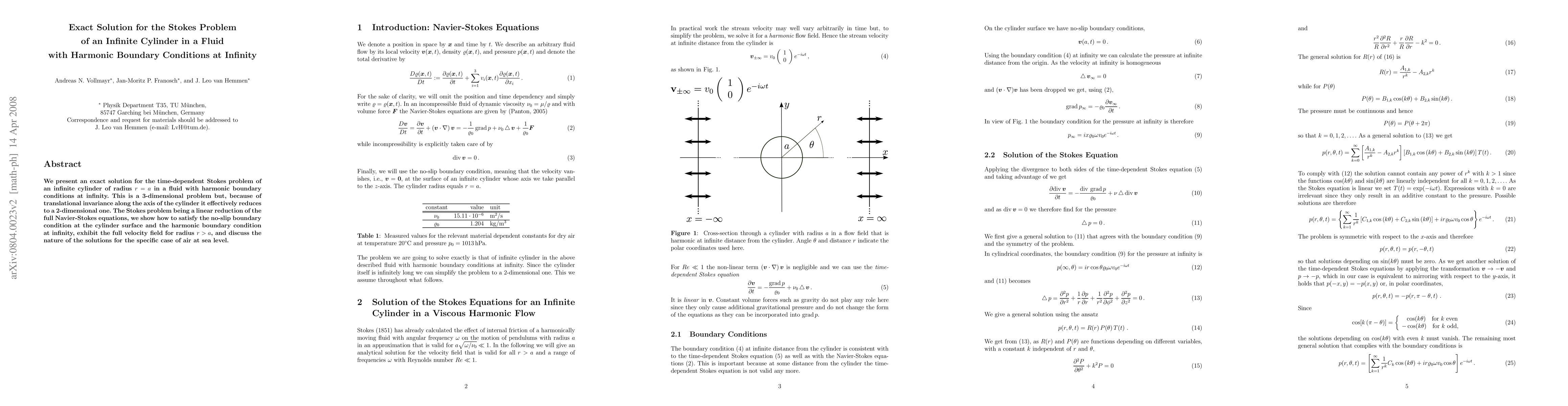 This paper provides an exact solution for the time-dependent Stokes problem of an infinite cylinder in a fluid, satisfying no-slip conditions at the cylinder surface and harmonic conditions at infinity. The 3D problem is effectively reduced to 2D due to translational invariance, detailing the velocity field for radii greater than the cylinder's radius.