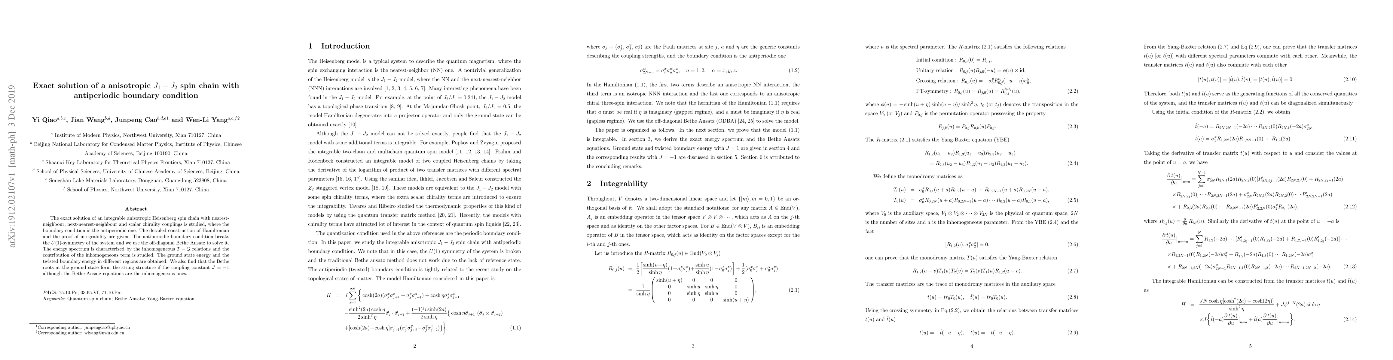 The exact solution of an integrable anisotropic Heisenberg spin chain with nearest-neighbour, next-nearest-neighbour and scalar chirality couplings is studied, where the boundary condition is the antiperiodic one. The detailed construction of Hamiltonian and the proof of integrability are given. The antiperiodic boundary condition breaks the $U(1)$-symmetry of the system and we use the off-diagonal Bethe Ansatz to solve it. The energy spectrum is characterized by the inhomogeneous $T-Q$ relations and the contribution of the inhomogeneous term is studied. The ground state energy and the twisted boundary energy in different regions are obtained. We also find that the Bethe roots at the ground state form the string structure if the coupling constant $J=-1$ although the Bethe Ansatz equations are the inhomogeneous ones.