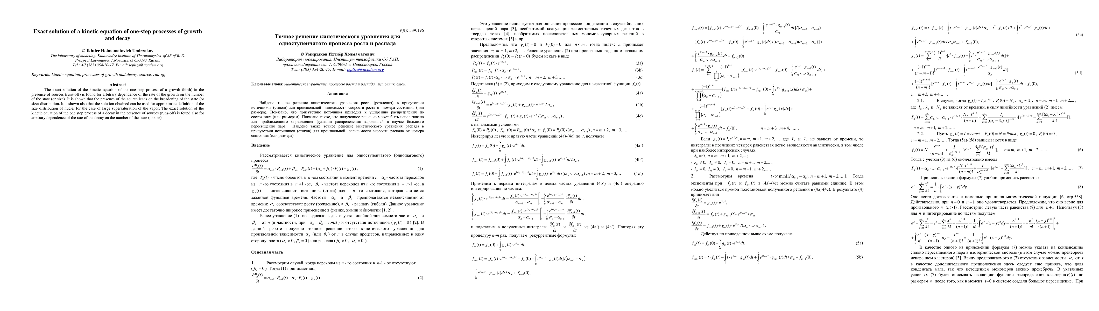 This paper presents exact solutions for kinetic equations describing one-step growth and decay processes, considering arbitrary rate dependencies on state size. It shows that sources lead to broadened state distributions and provides a solution applicable for approximating nucleus size distributions under high supersaturation conditions.