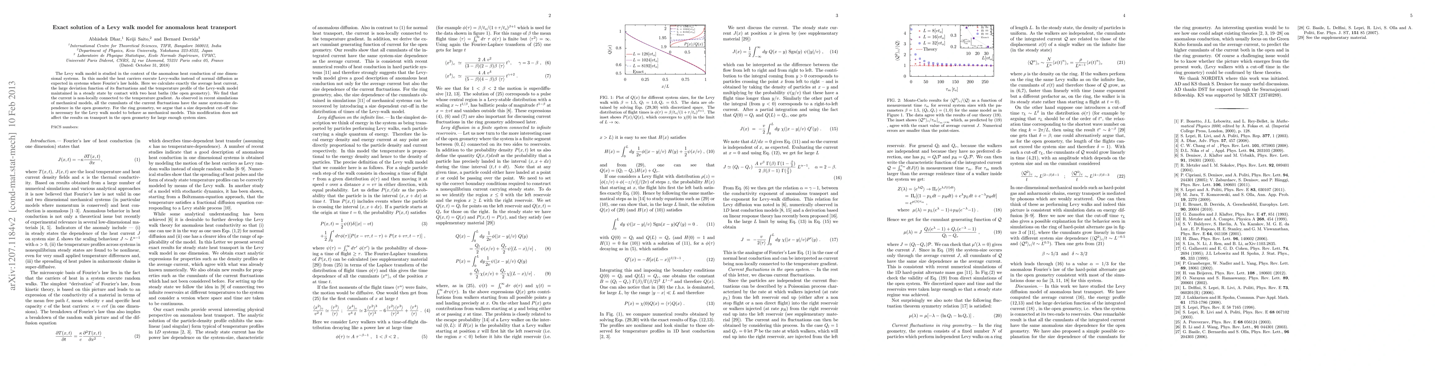 This paper provides an exact solution for a Levy walk model describing anomalous heat transport in one-dimensional systems, revealing that the average heat current is non-locally connected to the temperature gradient. The study also finds that the system-size dependence of current fluctuations aligns with recent simulations, while a size-dependent cut-off time is necessary for the model to match mechanical models in ring geometry.