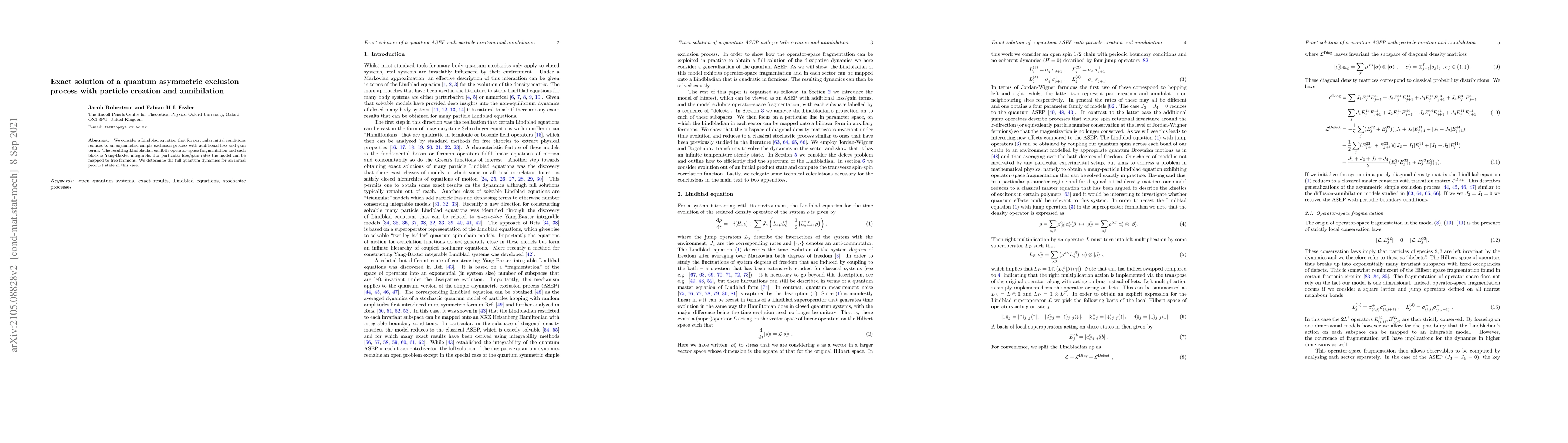 We consider a Lindblad equation that for particular initial conditions reduces to an asymmetric simple exclusion process with additional loss and gain terms. The resulting Lindbladian exhibits operator-space fragmentation and each block is Yang-Baxter integrable. For particular loss/gain rates the model can be mapped to free fermions. We determine the full quantum dynamics for an initial product state in this case.