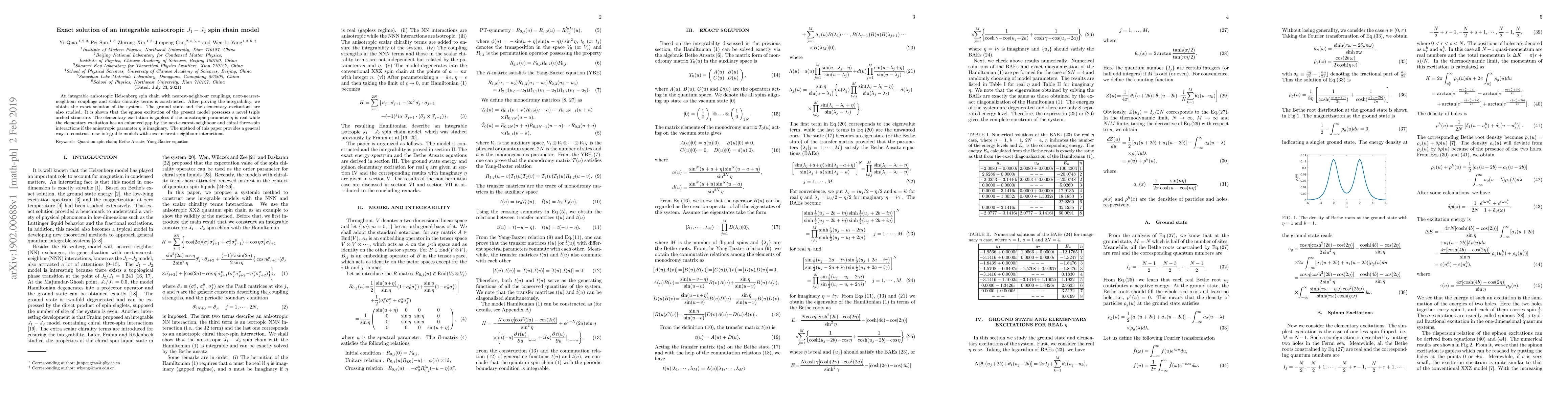 This paper constructs and solves an integrable anisotropic $J_1-J_2$ spin chain model, revealing a novel triple arched structure in spinon excitations. The model's ground state and excitations are analyzed, showing gapless excitations for real anisotropic parameters and enhanced gaps for imaginary ones, offering a method for constructing new integrable models.