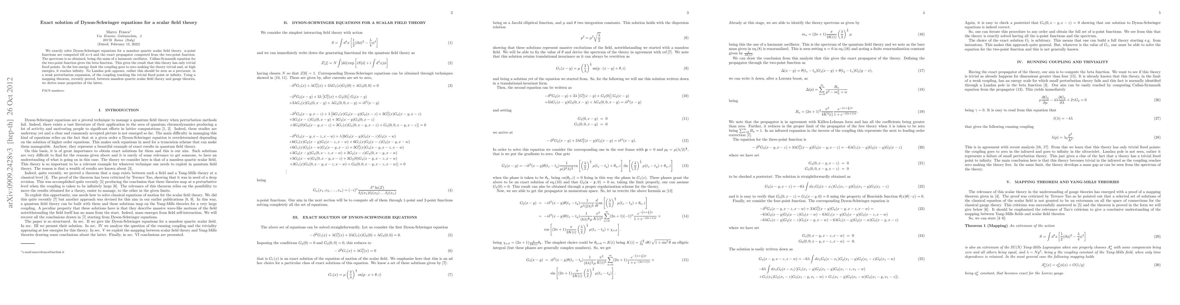 We exactly solve Dyson-Schwinger equations for a massless quartic scalar field theory. n-point functions are computed till n=4 and the exact propagator computed from the two-point function. The spectrum is so obtained, being the same of a harmonic oscillator. Callan-Symanzik equation for the two-point function gives the beta function. This gives the result that this theory has only trivial fixed points. In the low-energy limit the coupling goes to zero making the theory trivial and, at high energies, it reaches infinity. No Landau pole appears, rather this should be seen as a precursor, in a weak perturbation expansion, of the coupling reaching the trivial fixed point at infinity. Using a mapping theorem, recently proved, between massless quartic scalar field theory and gauge theories, we derive some properties of the latter.