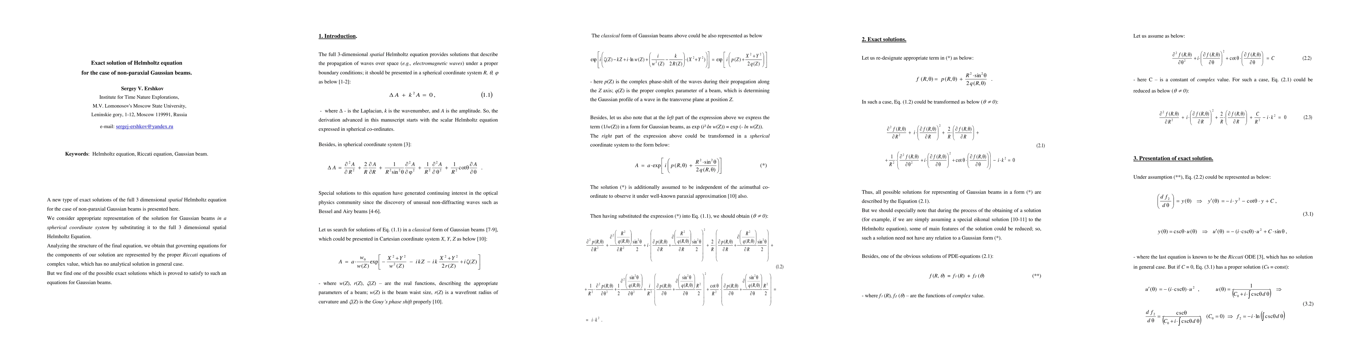 A new type of exact solutions of the full 3 dimensional spatial Helmholtz equation for the case of non-paraxial Gaussian beams is presented here. We consider appropriate representation of the solution for Gaussian beams in a spherical coordinate system by substituting it to the full 3 dimensional spatial Helmholtz Equation. Analyzing the structure of the final equation, we obtain that governing equations for the components of our solution are represented by the proper Riccati equations of complex value, which has no analytical solution in general case. But we find one of the possible exact solution which is proved to satisfy to such an equations for Gaussian beams. Decreasing of the amplitude A of presented solution up to the zero (at the appropriate meaning of angle parameter) could be associated with the existence of an optical vortex at this point. Optical vortex (also known as a "dislocation in wave trains") is a zero of an optical field, a point of zero intensity.