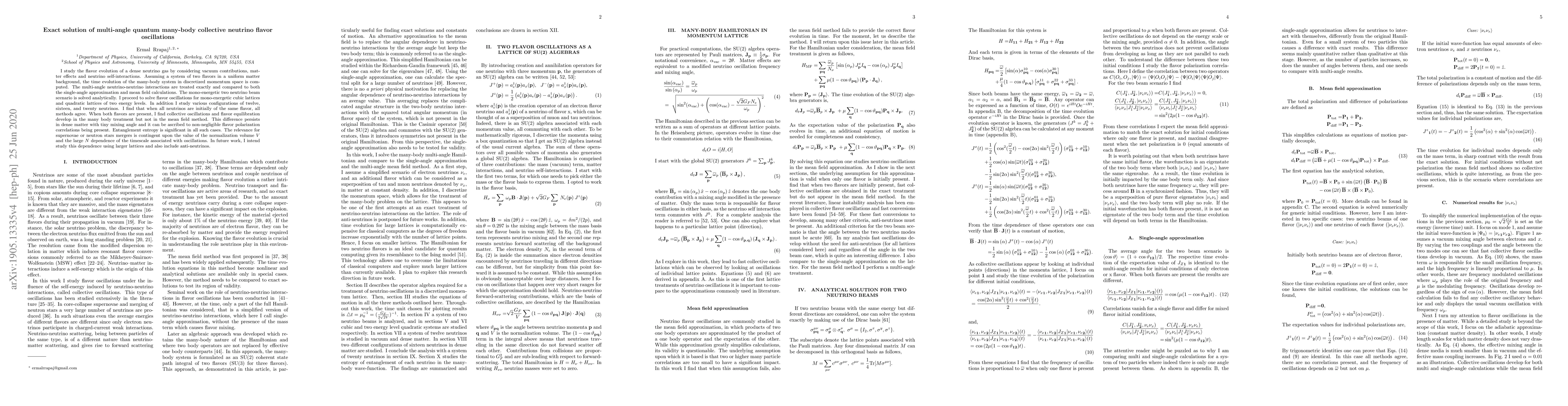 I study the flavor evolution of a dense neutrino gas by considering vacuum contributions, matter effects and neutrino self-interactions. Assuming a system of two flavors in a uniform matter background, the time evolution of the many-body system in discretized momentum space is computed. The multi-angle neutrino-neutrino interactions are treated exactly and compared to both the single-angle approximation and mean field calculations. %The time unit chosen is $\mu_0^{-1}=(\frac{G_F}{2\sqrt{2}V})^{-1}$. The mono-energetic two neutrino beam scenario is solved analytically. I proceed to solve flavor oscillations for mono-energetic cubic lattices and quadratic lattices of two energy levels. In addition I study various configurations of twelve, sixteen, and twenty neutrinos. I find that when all neutrinos are initially of the same flavor, all methods agree. When both flavors are present, I find collective oscillations and flavor equilibration develop in the many body treatment but not in the mean field method. This difference persists in dense matter with tiny mixing angle and it can be ascribed to non-negligible flavor polarization correlations being present. Entanglement entropy is significant in all such cases. The relevance for supernovae or neutron stars mergers is contingent upon the value of the normalization volume $V$ and the large $N$ dependence of the timescale associated with oscillations. In future work, I intend to study this dependence using larger lattices and also include anti-neutrinos.