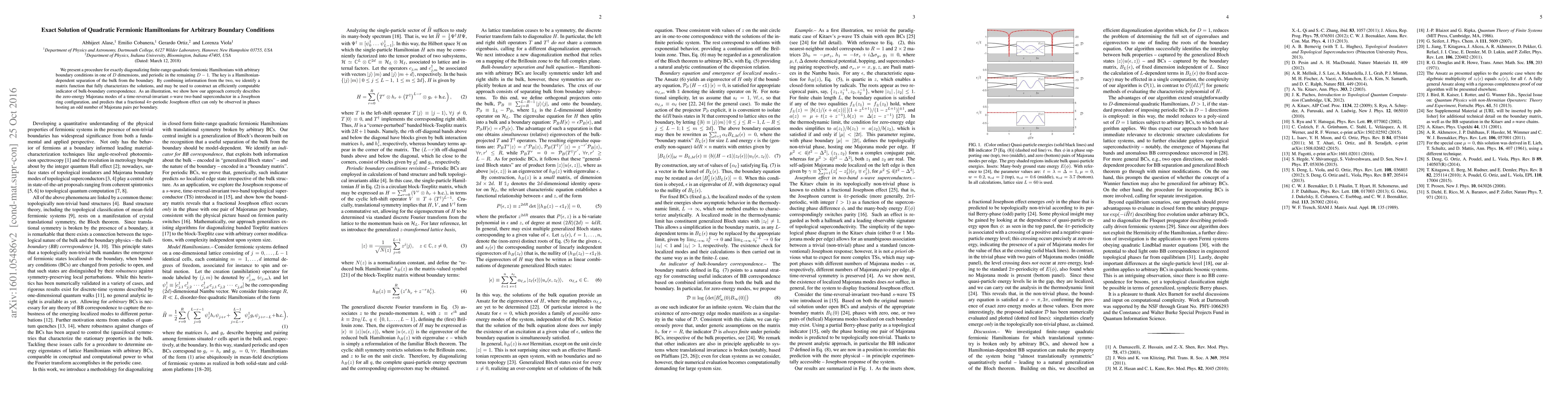 We present a procedure for exactly diagonalizing finite-range quadratic fermionic Hamiltonians with arbitrary boundary conditions in one of D dimensions, and periodic in the remaining D-1. The key is a Hamiltonian-dependent separation of the bulk from the boundary. By combining information from the two, we identify a matrix function that completely characterizes the solutions, and allow to identify an indicator of bulk-boundary correspondence. As an illustration, we show how our method correctly describes the zero-energy Majorana modes of a time-reversal-invariant s-wave superconductor in a Josephson ring configuration, and predicts that a fractional 4 pi Josephson effect can only be observed in phases hosting an odd number of Majorana pairs.