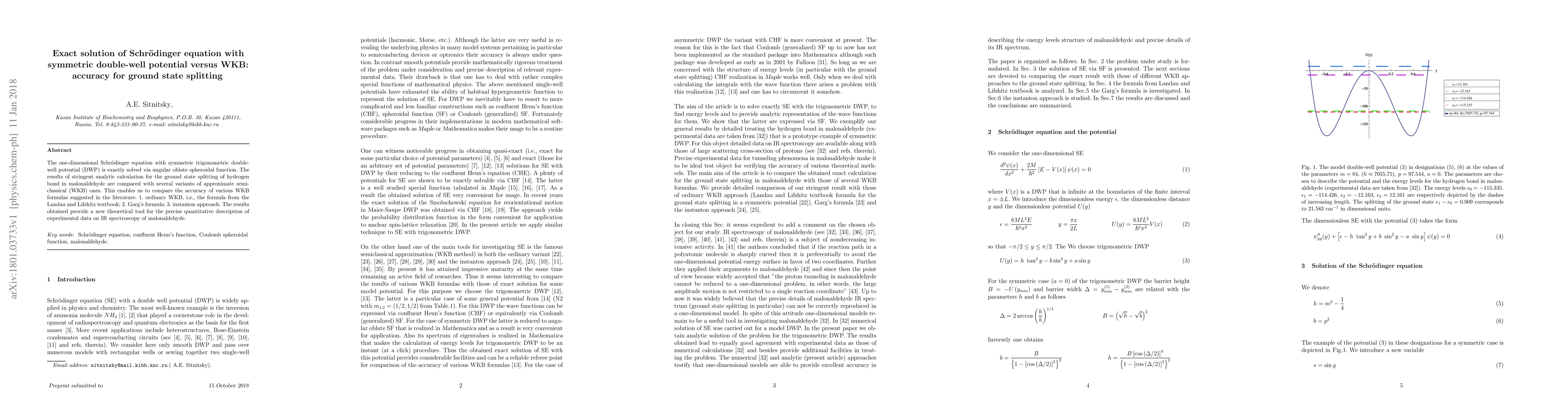 This paper presents an exact solution to the Schrödinger equation for a symmetric double-well potential using angular oblate spheroidal functions and compares it with various WKB approximations to assess their accuracy in predicting the ground state splitting, particularly for malonaldehyde's hydrogen bond. The findings offer a refined theoretical framework for interpreting IR spectroscopy data.