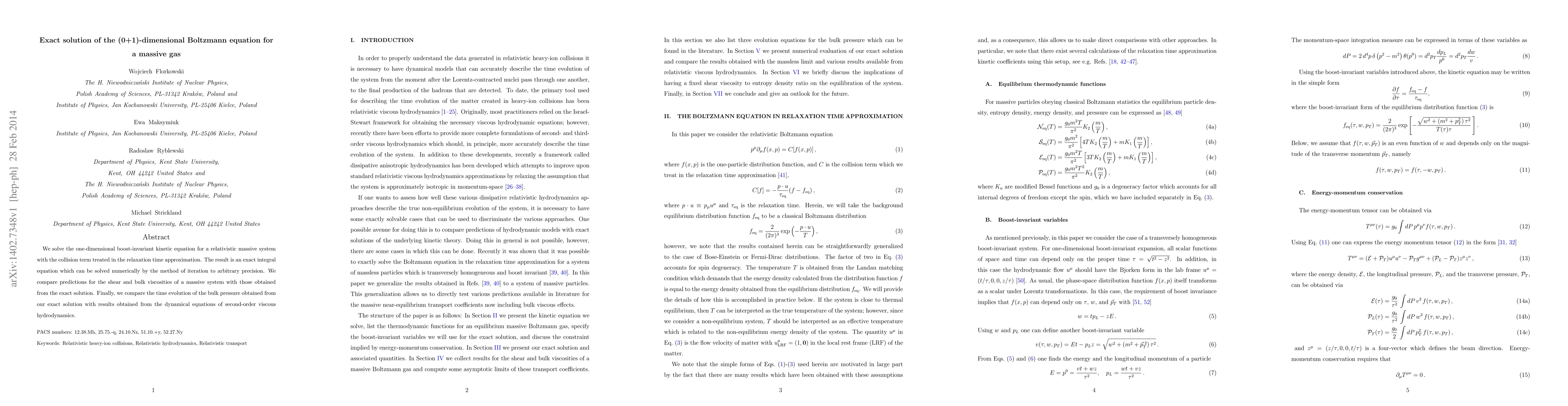 This paper provides an exact integral solution to the (0+1)-dimensional Boltzmann equation for a relativistic massive gas, solved numerically via iteration. It compares the derived shear and bulk viscosities with predictions from the exact solution and examines the time evolution of bulk pressure against second-order viscous hydrodynamics.