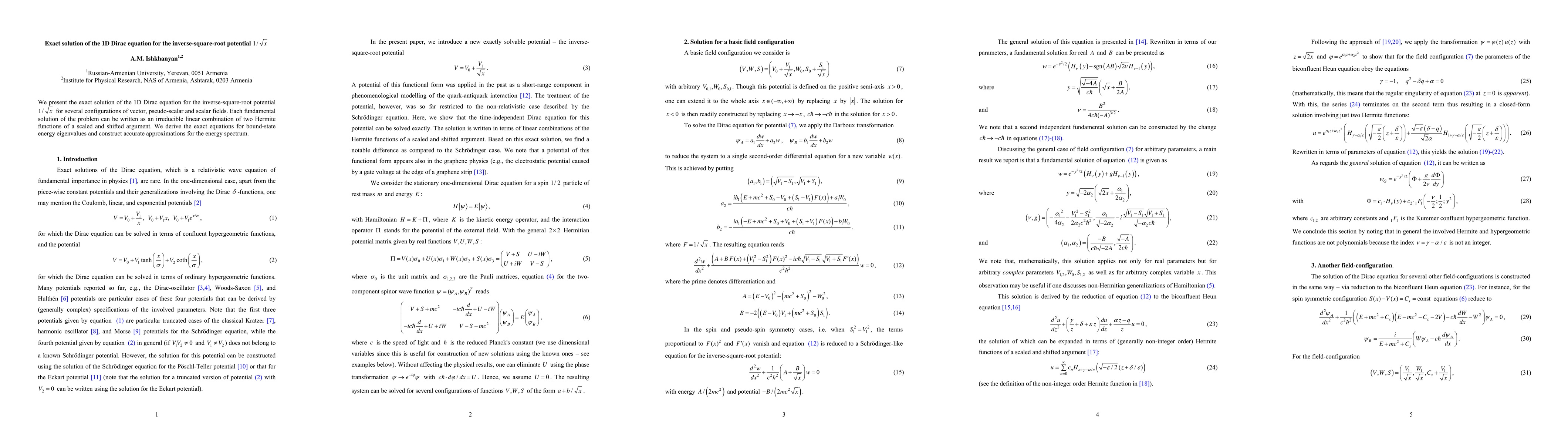 The research presents an exact solution for the 1D Dirac equation with an inverse-square-root potential $1/\sqrt{x}$ using Hermite functions and the biconfluent Heun equation.