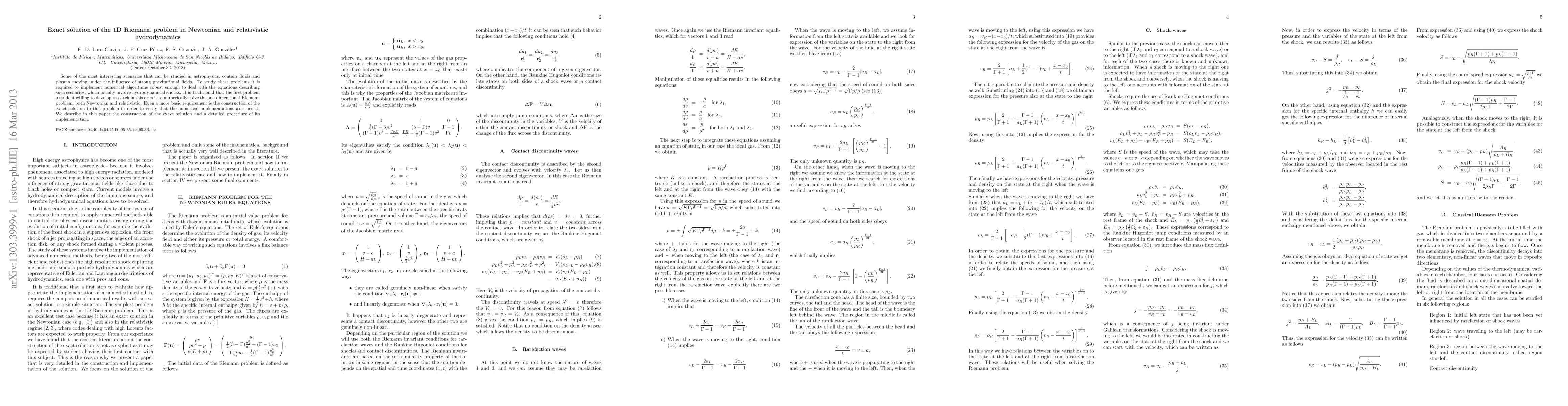The paper provides the exact solution for the 1D Riemann problem in both Newtonian and relativistic hydrodynamics, offering a crucial reference for validating numerical algorithms used in astrophysical fluid dynamics involving strong gravitational fields and hydrodynamical shocks. The detailed procedure aids in ensuring the accuracy of computational implementations.