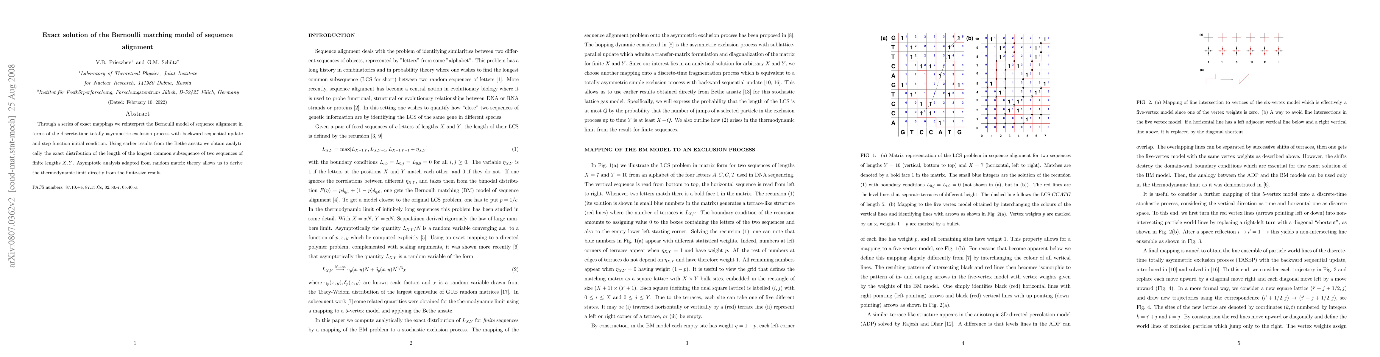 Through a series of exact mappings we reinterpret the Bernoulli model of sequence alignment in terms of the discrete-time totally asymmetric exclusion process with backward sequential update and step function initial condition. Using earlier results from the Bethe ansatz we obtain analytically the exact distribution of the length of the longest common subsequence of two sequences of finite lengths $X,Y$. Asymptotic analysis adapted from random matrix theory allows us to derive the thermodynamic limit directly from the finite-size result.