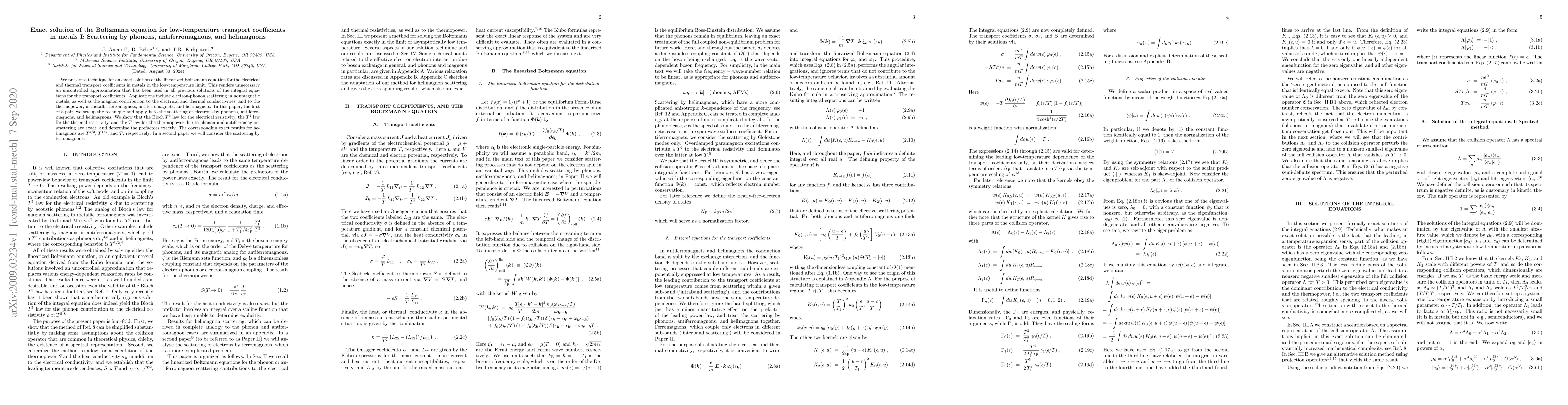 This paper presents an exact solution technique for the linearized Boltzmann equation to determine electrical and thermal transport coefficients in metals at low temperatures, eliminating previous approximations. It applies the method to electron scattering by phonons, antiferromagnons, and helimagnons, confirming exact low-temperature laws for resistivity, thermal resistivity, and thermopower, with precise prefactors.