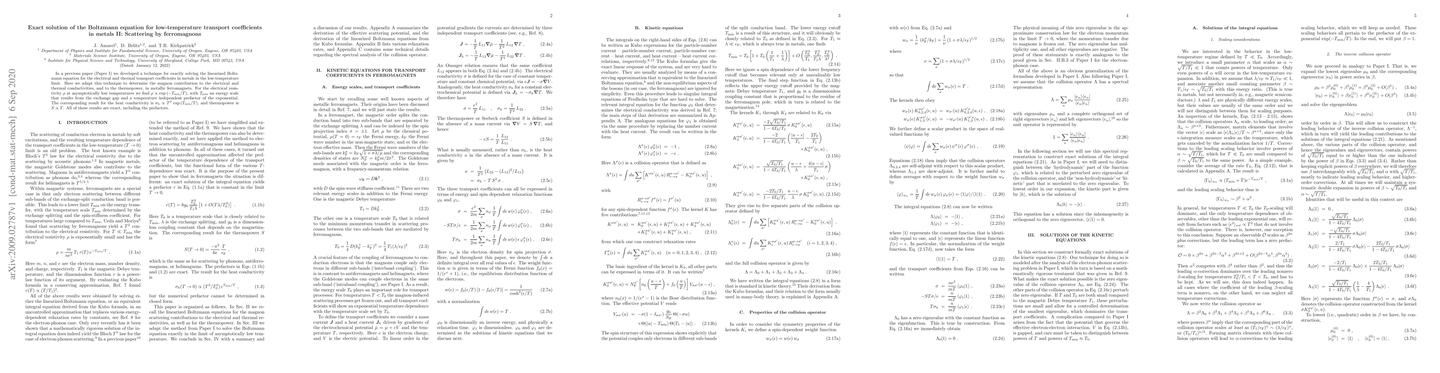 In a previous paper (Paper I) we developed a technique for exactly solving the linearized Boltzmann equation for the electrical and thermal transport coefficients in metals in the low-temperature limit. Here we adapt this technique to determine the magnon contribution to the electrical and thermal conductivities, and to the thermopower, in metallic ferromagnets. For the electrical resistivity $\rho$ at asymptotically low temperatures we find $\rho \propto \exp{(-T_{\rm min}/T)}$, with $T_{\rm min}$ an energy scale that results from the exchange gap and a temperature independent prefactor of the exponential. The corresponding result for the heat conductivity is $\sigma_h \propto T^3\,\exp{(T_{\rm min}/T)}$, and thermopower is $S \propto T$. All of these results are exact, including the prefactors.