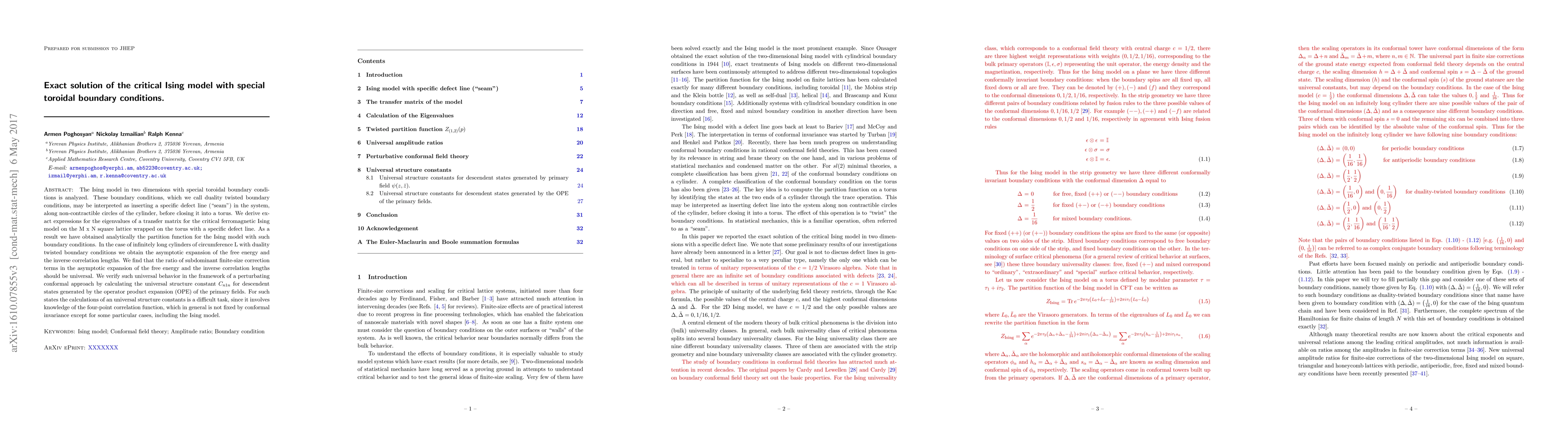 This paper derives exact expressions for the eigenvalues of the transfer matrix and the partition function for the critical Ising model under special toroidal boundary conditions, revealing universal asymptotic behavior in the free energy and correlation lengths. It also provides a perturbative conformal approach to calculate universal structure constants for descendent states.
