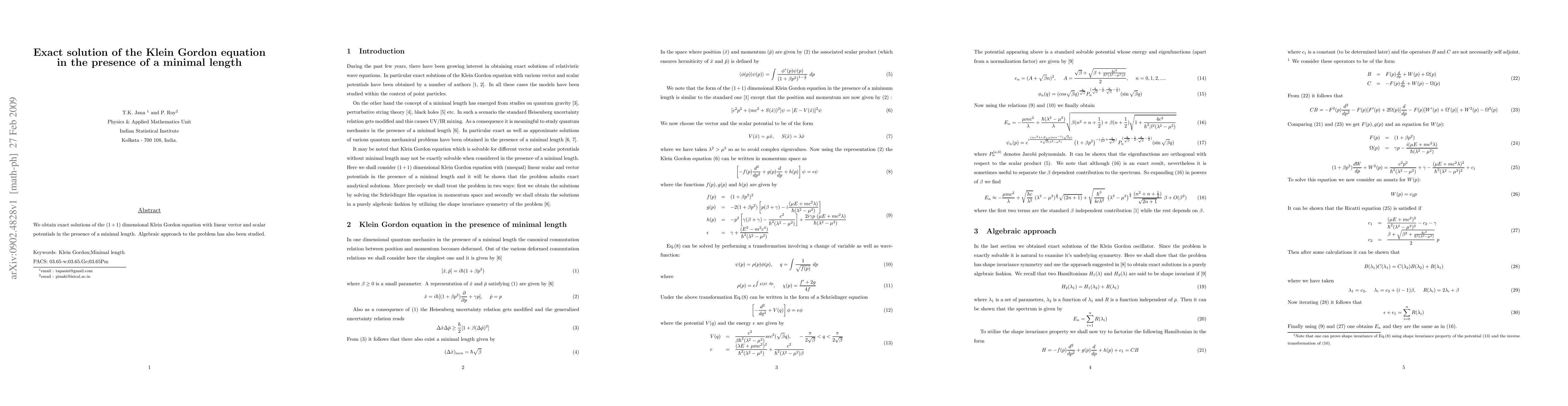 Summary: This paper provides exact solutions to the (1+1) dimensional Klein Gordon equation under the influence of linear vector and scalar potentials, incorporating a minimal length effect. An algebraic methodology is employed to explore the problem.