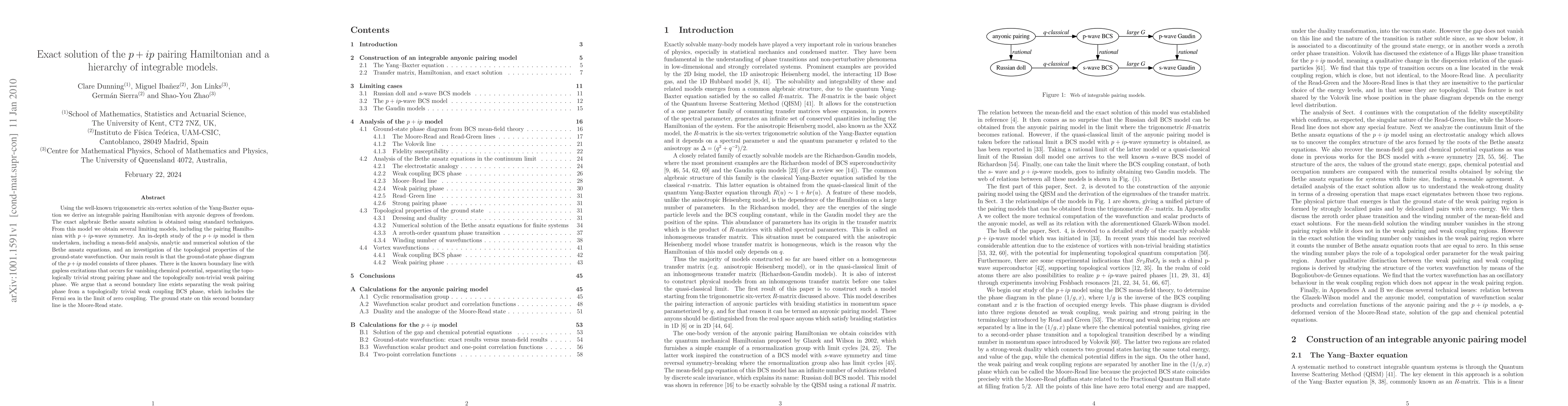 Using the well-known trigonometric six-vertex solution of the Yang-Baxter equation we derive an integrable pairing Hamiltonian with anyonic degrees of freedom. The exact algebraic Bethe ansatz solution is obtained using standard techniques. From this model we obtain several limiting models, including the pairing Hamiltonian with p+ip-wave symmetry. An in-depth study of the p+ip model is then undertaken, including a mean-field analysis, analytic and numerical solution of the Bethe ansatz equations, and an investigation of the topological properties of the ground-state wavefunction. Our main result is that the ground-state phase diagram of the p+ip model consists of three phases. There is the known boundary line with gapless excitations that occurs for vanishing chemical potential, separating the topologically trivial strong pairing phase and the topologically non-trivial weak pairing phase. We argue that a second boundary line exists separating the weak pairing phase from a topologically trivial weak coupling BCS phase, which includes the Fermi sea in the limit of zero coupling. The ground state on this second boundary line is the Moore-Read state.