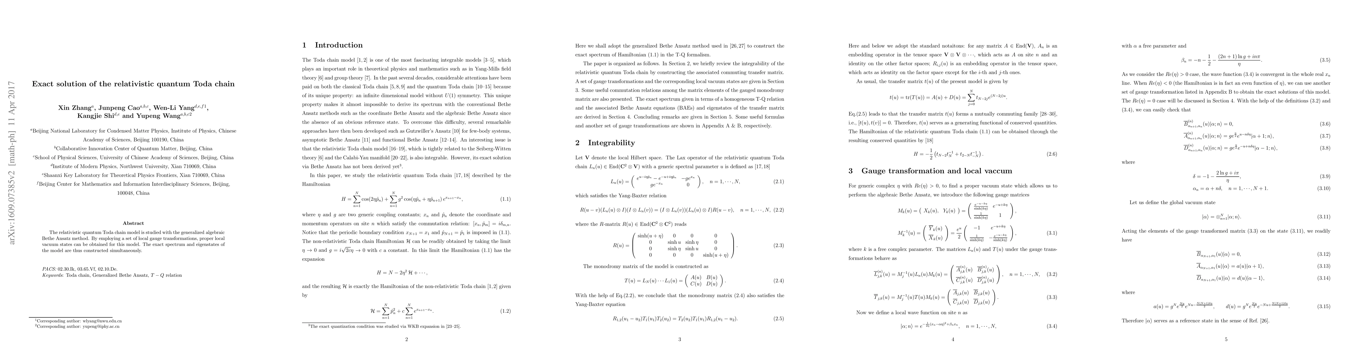 The paper presents an exact solution for the relativistic quantum Toda chain using the generalized algebraic Bethe Ansatz, deriving the exact spectrum and eigenstates through local gauge transformations. This method allows for the construction of proper local vacuum states and provides a comprehensive analytical treatment of the model.