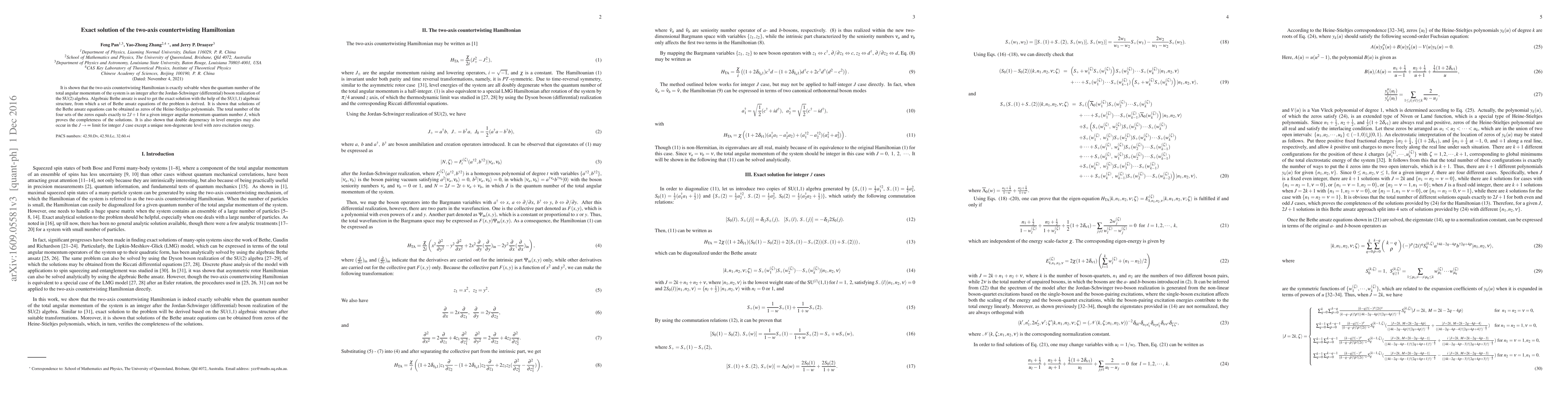It is shown that the two-axis countertwisting Hamiltonian is exactly solvable when the quantum number of the total angular momentum of the system is an integer after the Jordan-Schwinger (differential) boson realization of the SU(2) algebra. Algebraic Bethe ansatz is used to get the exact solution with the help of the SU(1,1) algebraic structure, from which a set of Bethe ansatz equations of the problem is derived. It is shown that solutions of the Bethe ansatz equations can be obtained as zeros of the Heine-Stieltjes polynomials. The total number of the four sets of the zeros equals exactly to $2J+1$ for a given integer angular momentum quantum number $J$, which proves the completeness of the solutions. It is also shown that double degeneracy in level energies may also occur in the $J\rightarrow\infty$ limit for integer $J$ case except a unique non-degenerate level with zero excitation energy.