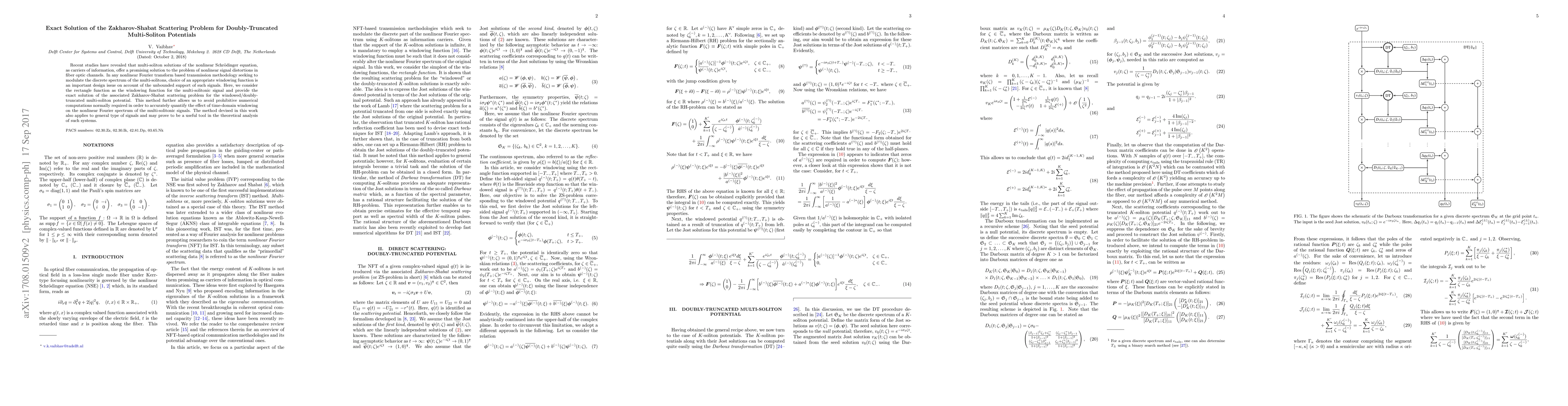 This paper presents an exact solution to the Zakharov-Shabat scattering problem for doubly-truncated multi-soliton potentials using a rectangle function as the windowing method. This approach avoids extensive numerical computations and can be applied to various signal types, aiding in the theoretical analysis of nonlinear signal distortions in fiber optic channels.