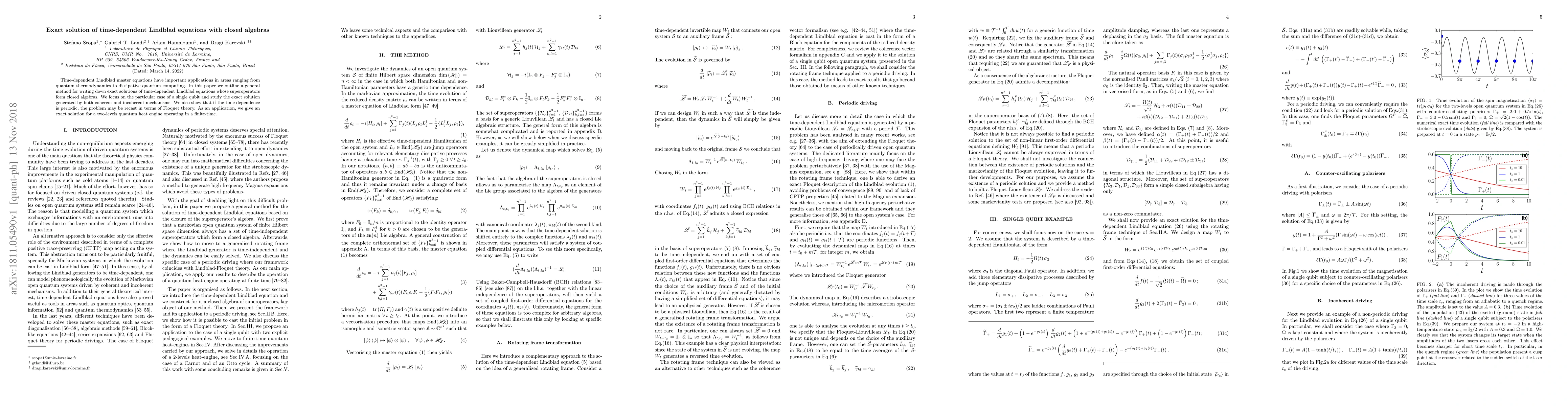 This paper presents a method for deriving exact solutions of time-dependent Lindblad equations with closed superoperator algebras, specifically for a single qubit. It also applies Floquet theory to periodic time-dependence and provides an exact solution for a two-level quantum heat engine operating in finite time.