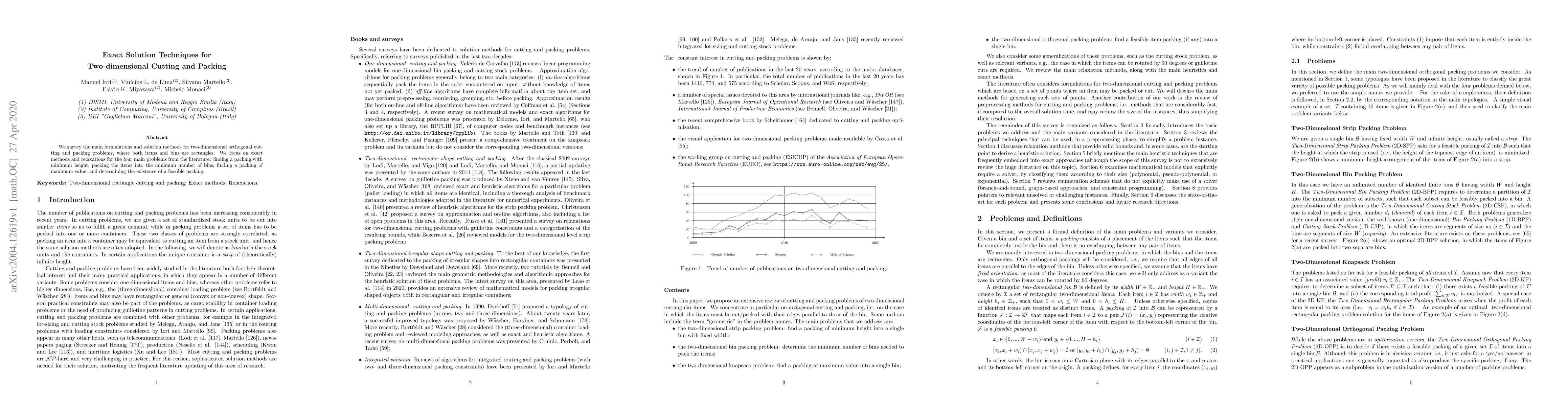 This paper surveys exact solution techniques for two-dimensional orthogonal cutting and packing problems involving rectangular items and bins. It focuses on four main problems: minimizing packing height, minimizing bins used, maximizing packing value, and determining feasible packings.