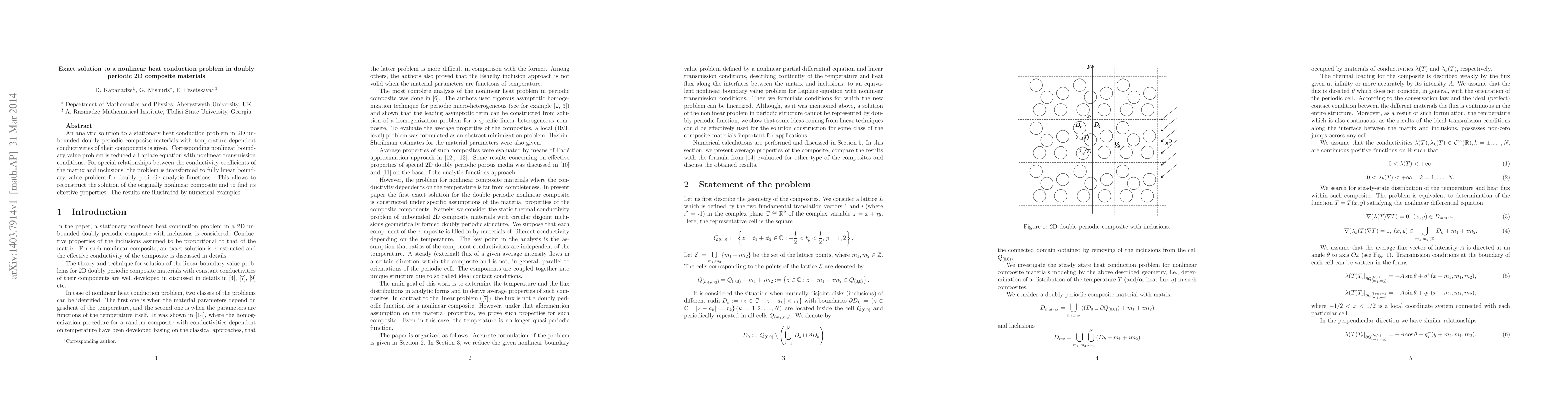 This paper presents an exact analytic solution for a stationary heat conduction problem in doubly periodic 2D composite materials with temperature-dependent conductivities, transforming the problem into a linear boundary value issue for special conductivity ratios, and illustrates the findings with numerical examples.