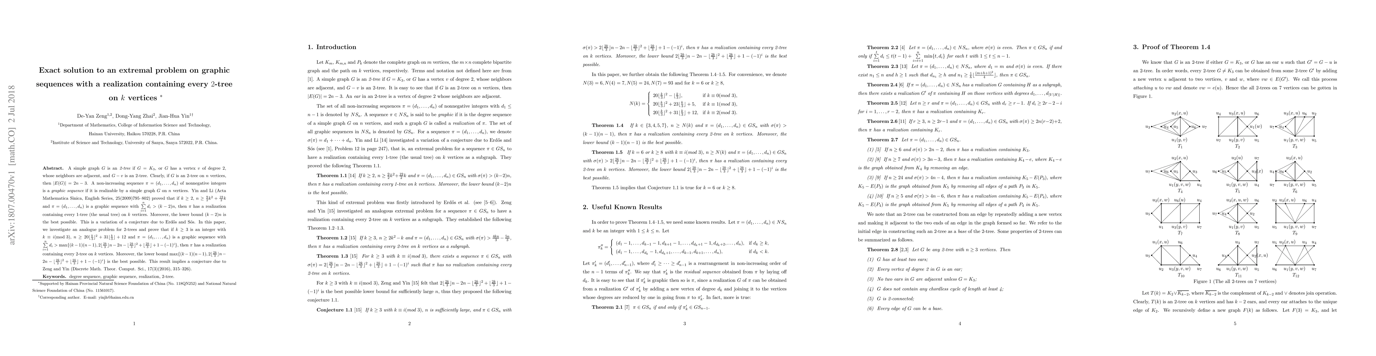 A simple graph $G$ is an {\it 2-tree} if $G=K_3$, or $G$ has a vertex $v$ of degree 2, whose neighbors are adjacent, and $G-v$ is an 2-tree. Clearly, if $G$ is an 2-tree on $n$ vertices, then $|E(G)|=2n-3$. A non-increasing sequence $\pi=(d_1,\ldots,d_n)$ of nonnegative integers is a {\it graphic sequence} if it is realizable by a simple graph $G$ on $n$ vertices. Yin and Li (Acta Mathematica Sinica, English Series, 25(2009)795--802) proved that if $k\ge 2$, $n\ge \frac{9}{2}k^2+\frac{19}{2}k$ and $\pi=(d_1,\ldots,d_n)$ is a graphic sequence with $\sum\limits_{i=1}^n d_i>(k-2)n$, then $\pi$ has a realization containing every 1-tree (the usual tree) on $k$ vertices. Moreover, the lower bound $(k-2)n$ is the best possible. This is a variation of a conjecture due to Erd\H{o}s and S\'{o}s. In this paper, we investigate an analogue problem for $2$-trees and prove that if $k\ge 3$ is an integer with $k\equiv i(\mbox{mod }3)$, $n\geq20\lfloor\frac{k}{3}\rfloor^2+31\lfloor\frac{k}{3}\rfloor+12$ and $\pi=(d_1,\ldots,d_n)$ is a graphic sequence with $\sum\limits_{i=1}^n d_i>\max\{(k-1)(n-1),2\lfloor\frac{2k}{3}\rfloor n-2n-\lfloor\frac{2k}{3}\rfloor^2+\lfloor\frac{2k}{3}\rfloor+1-(-1)^i\}$, then $\pi$ has a realization containing every 2-tree on $k$ vertices. Moreover, the lower bound $\max\{(k-1)(n-1),2\lfloor\frac{2k}{3}\rfloor n-2n-\lfloor\frac{2k}{3}\rfloor^2+\lfloor\frac{2k}{3}\rfloor+1-(-1)^i\}$ is the best possible. This result implies a conjecture due to Zeng and Yin (Discrete Math. Theor. Comput. Sci., 17(3)(2016), 315--326).