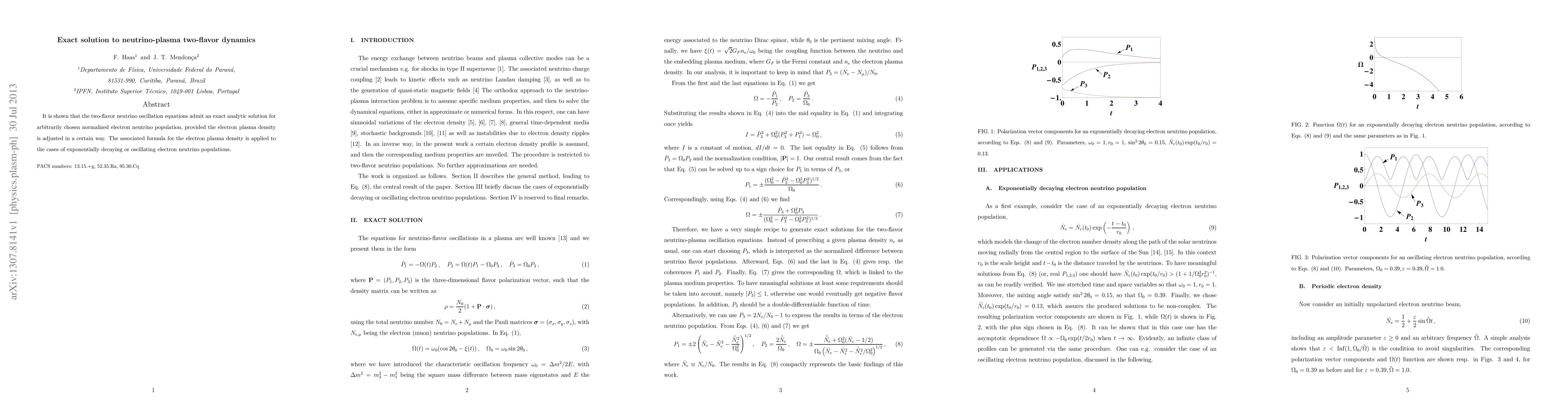 It is shown that the two-flavor neutrino oscillation equations admit an exact analytic solution for arbitrarily chosen normalized electron neutrino population, provided the electron plasma density is adjusted in a certain way. The associated formula for the electron plasma density is applied to the cases of exponentially decaying or oscillating electron neutrino populations.