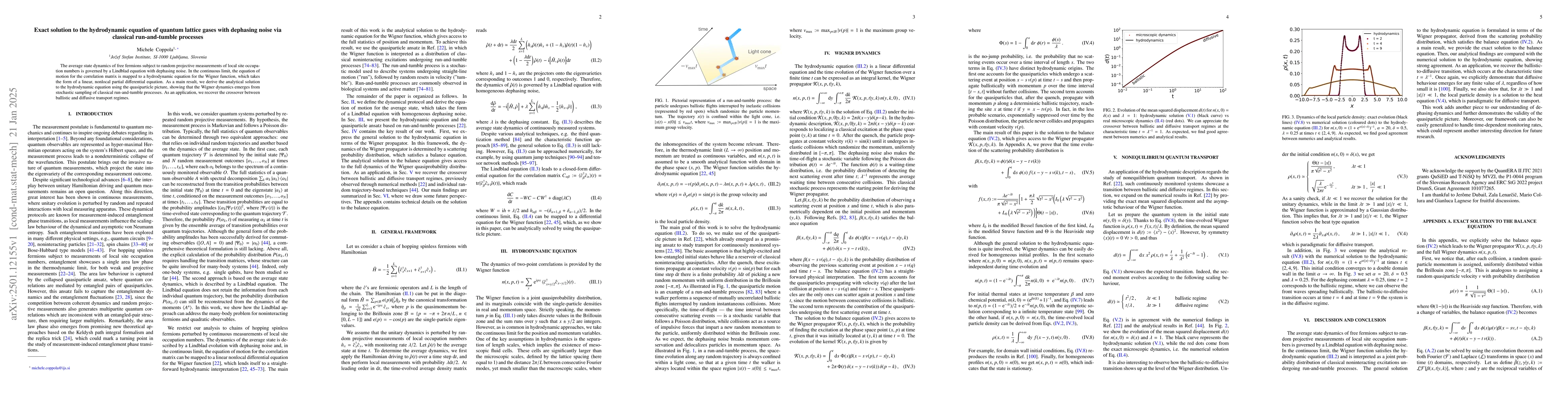 This paper presents an analytical solution to the hydrodynamic equation governing the dynamics of free fermions with dephasing noise in quantum lattice gases. The authors derive this solution using the quasiparticle picture, revealing that the Wigner dynamics results from stochastic classical run-and-tumble processes, and apply it to show the crossover between ballistic and diffusive transport regimes.