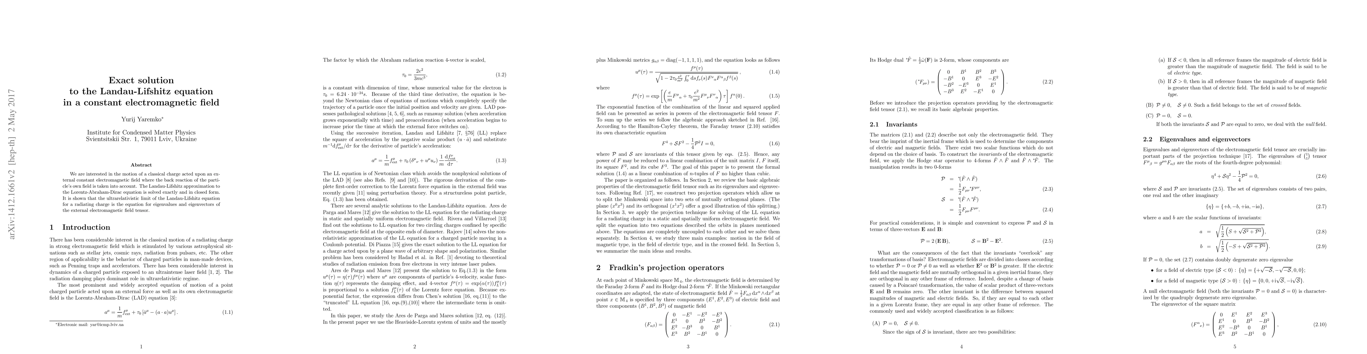 This paper presents an exact solution to the Landau-Lifshitz equation for a classical charge in a constant electromagnetic field, accounting for the particle's own field back reaction. The ultrarelativistic limit of the equation reveals its equivalence to the external electromagnetic field tensor's eigenvalues and eigenvectors.