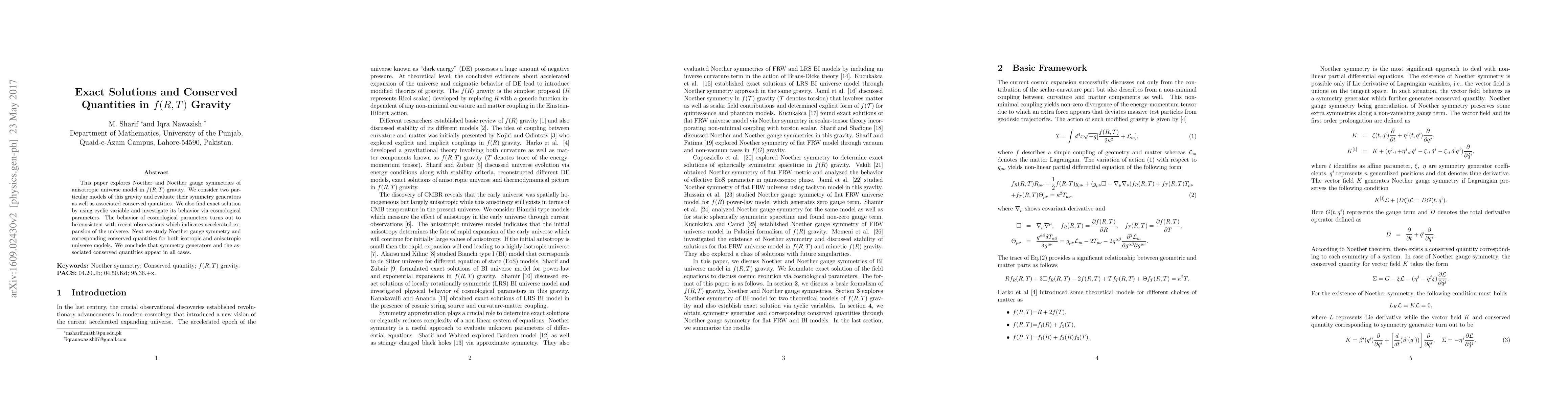 This paper investigates Noether and Noether gauge symmetries in $f(R,T)$ gravity for anisotropic universe models, deriving exact solutions and conserved quantities that align with recent observations of accelerated cosmic expansion. It concludes that symmetry generators and conserved quantities are present in both isotropic and anisotropic models.