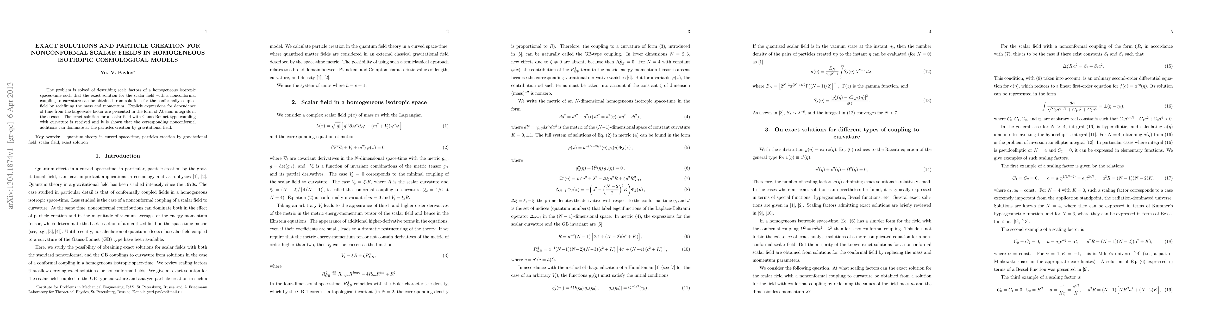 The problem is solved of describing scale factors of a homogeneous isotropic spaces-time such that the exact solution for the scalar field with a nonconformal coupling to curvature can be obtained from solutions for the conformally coupled field by redefining the mass and momentum. Explicit expressions for dependence of time from the large-scale factor are presented in the form of Abelian integrals in these cases. The exact solution for a scalar field with Gauss-Bonnet type coupling with curvature is received and it is shown that the corresponding nonconformal additions can dominate at the particles creation by gravitational field.