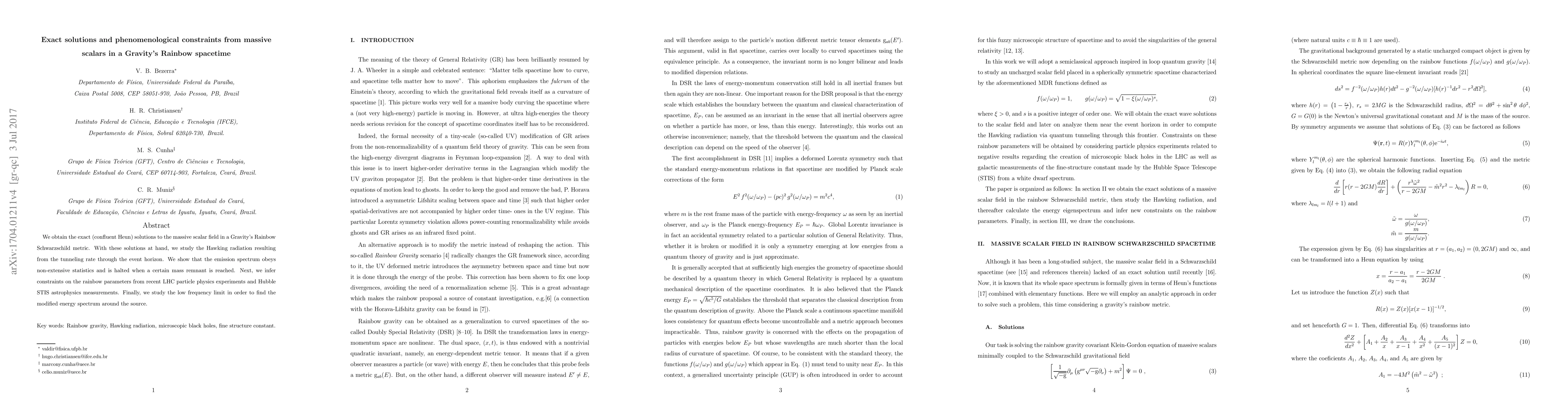 We obtain the exact (confluent Heun) solutions to the massive scalar field in a Gravity's Rainbow Schwarzschild metric. With these solutions at hand, we study the Hawking radiation resulting from the tunneling rate through the event horizon. We show that the emission spectrum obeys non-extensive statistics and is halted when a certain mass remnant is reached. Next, we infer constraints on the rainbow parameters from recent LHC particle physics experiments and Hubble STIS astrophysics measurements. Finally, we study the low frequency limit in order to find the modified energy spectrum around the source.