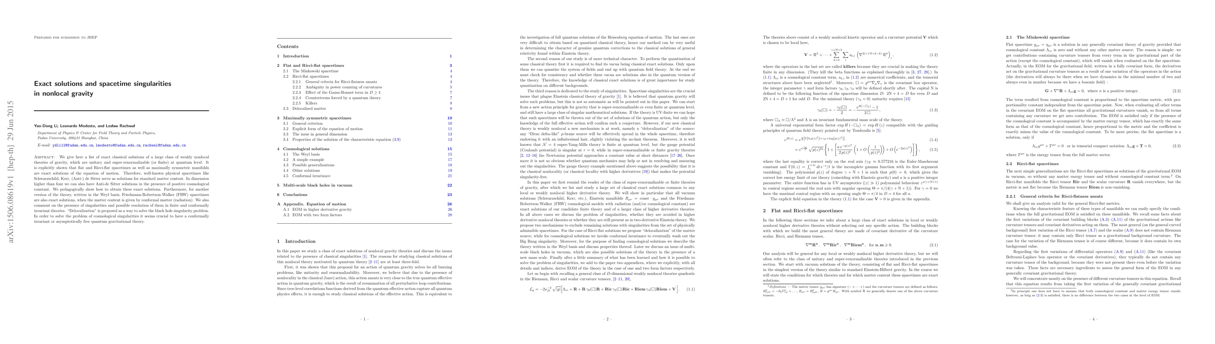 We give here a list of exact classical solutions of a large class of weakly nonlocal theories of gravity, which are unitary and super-renormalizable (or finite) at quantum level. It is explicitly shown that flat and Ricci-flat spacetimes as well as maximally symmetric manifolds are exact solutions of the equation of motion. Therefore, well-known physical spacetimes like Schwarzschild, Kerr, (Anti-) de Sitter serve as solutions for standard matter content. In dimension higher than four we can also have Anti-de Sitter solutions in the presence of positive cosmological constant. We pedagogically show how to obtain these exact solutions. Furthermore, for another version of the theory, written in the Weyl basis, Friedmann-Robertson-Walker (FRW) spacetimes are also exact solutions, when the matter content is given by conformal matter (radiation). We also comment on the presence of singularities and possible resolution of them in finite and conformally invariant theories. "Delocalization" is proposed as a way to solve the black hole singularity problem. In order to solve the problem of cosmological singularities it seems crucial to have a conformally invariant or asymptotically free quantum gravitational theory.