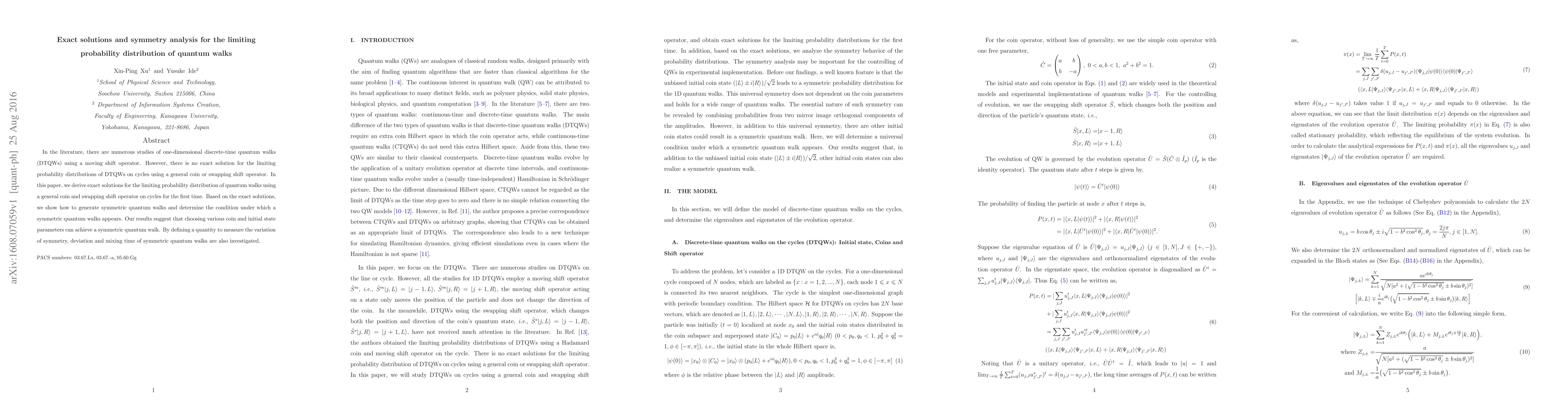 This paper derives exact solutions for the limiting probability distribution of quantum walks on cycles using general coin and swapping shift operators. It also explores symmetric quantum walks, identifying conditions for their appearance and analyzing deviation and mixing times.