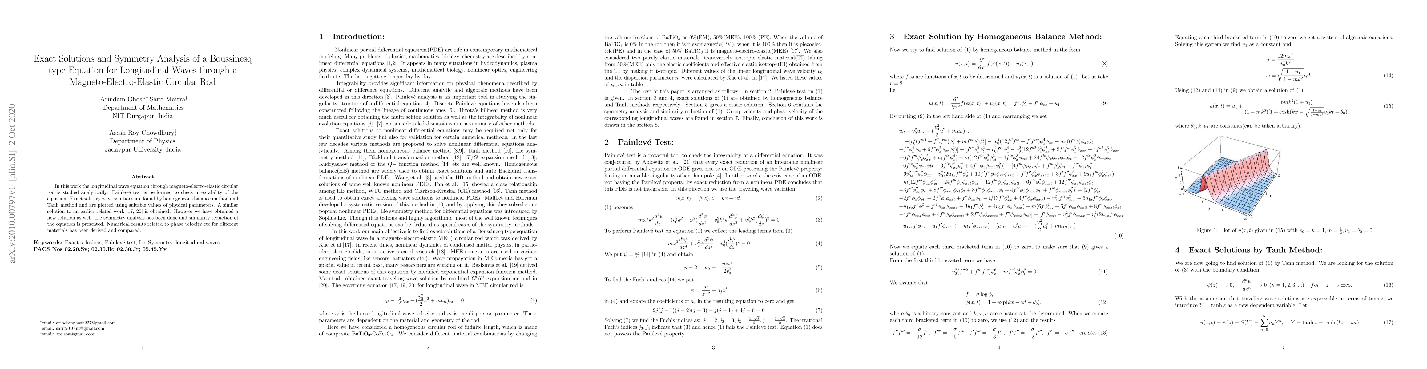 In this work the longitudinal wave equation through magneto-electro-elastic circular rod is studied analytically. Painlev\'e test is performed to check integrability of the equation. Exact solitary wave solutions are found by homogeneous balance method and Tanh method and are plotted using suitable values of physical parameters. A similar solution to an earlier related work [17, 20] is obtained. However we have obtained a new solution as well. Lie symmetry analysis has been done and similarity reduction of the equation is presented. Numerical results related to phase velocity etc for different materials has been derived and compared.