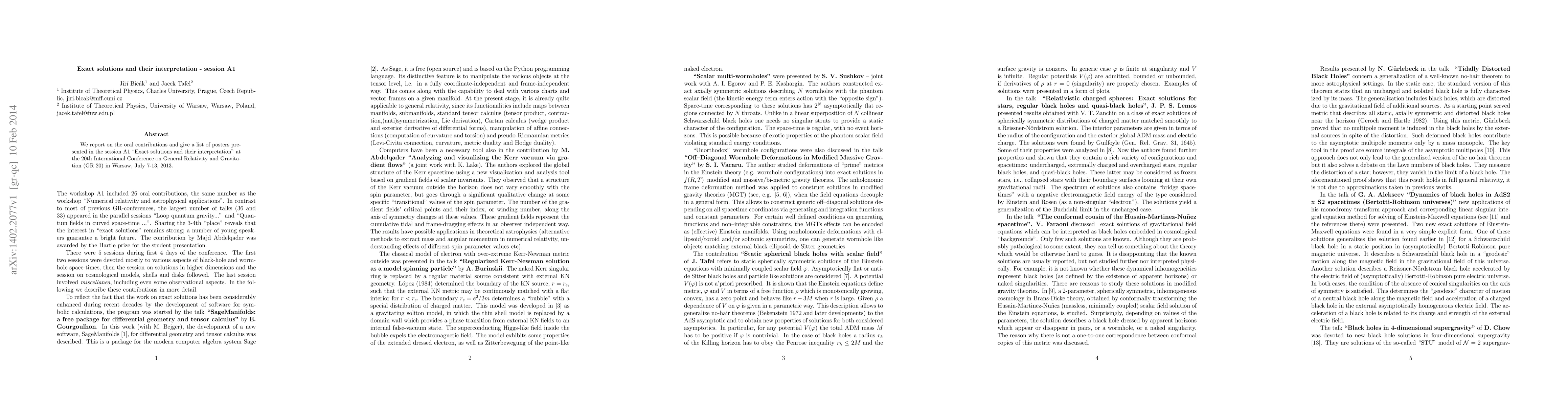 We report on the oral contributions and give a list of posters presented in the session A1 "Exact solutions and their interpretation" at the 20th International Conference on General Relativity and Gravitation (GR 20) in Warsaw, July 7-13, 2013.