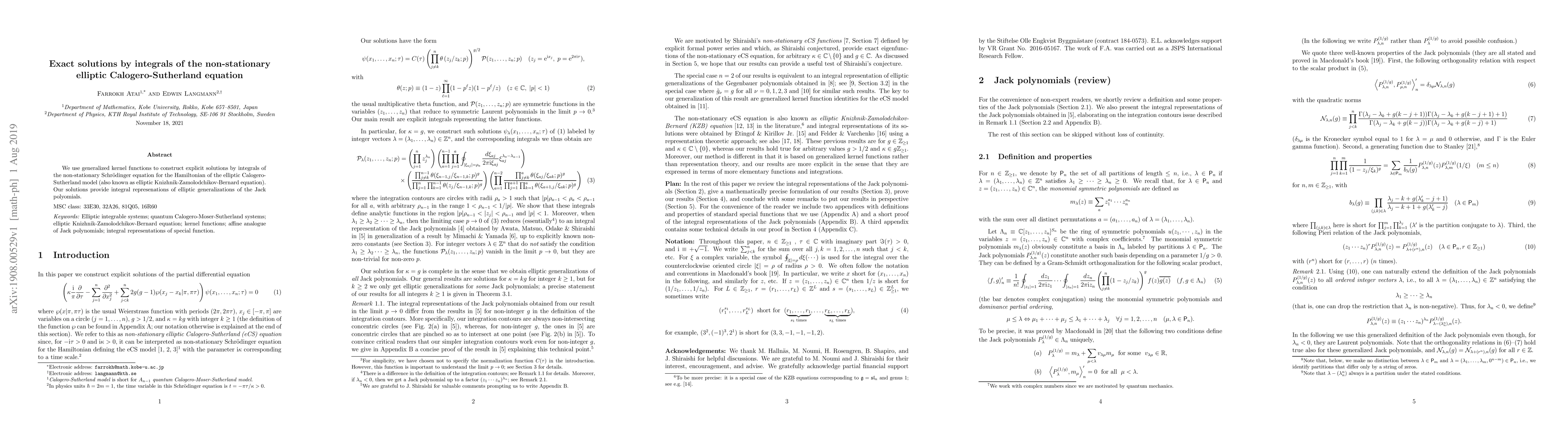 This paper constructs explicit solutions to the non-stationary elliptic Calogero-Sutherland equation using generalized kernel functions, providing integral representations of elliptic generalizations of the Jack polynomials.