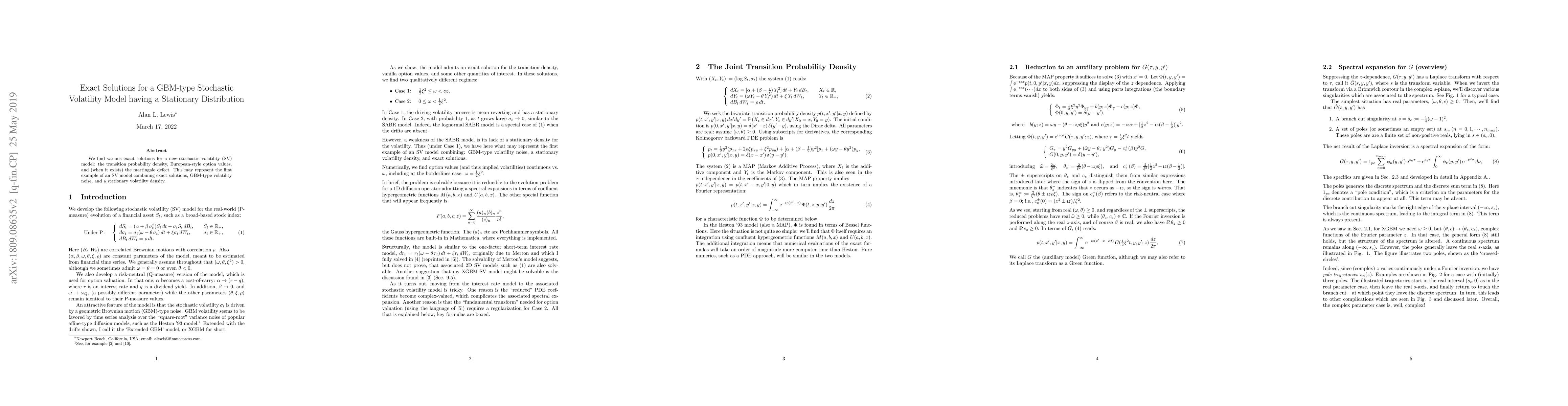 We find various exact solutions for a new stochastic volatility (SV) model: the transition probability density, European-style option values, and (when it exists) the martingale defect. This may represent the first example of an SV model combining exact solutions, GBM-type volatility noise, and a stationary volatility density.