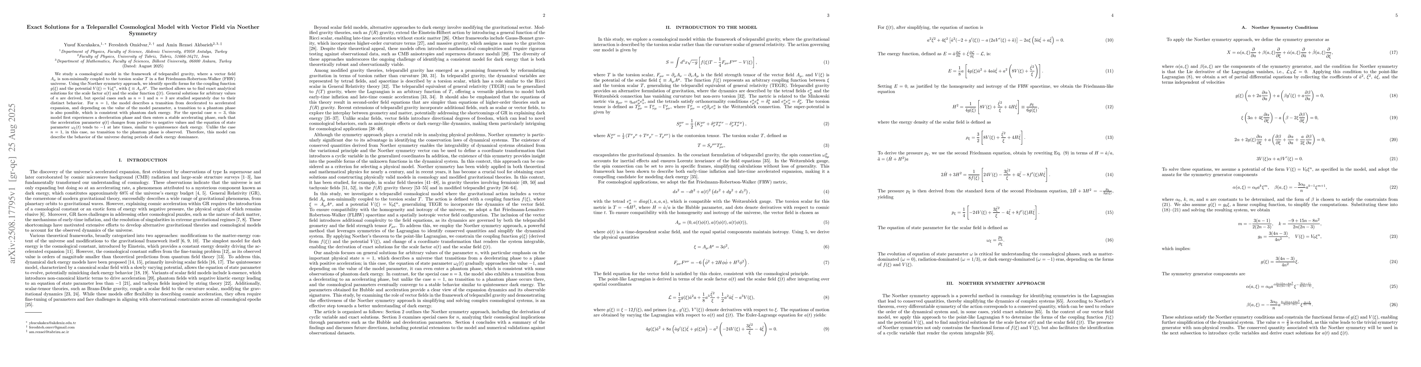 We study a cosmological model in the framework of teleparallel gravity, where a vector field $A_\mu$ is non-minimally coupled to the torsion scalar $T$ in a flat Friedmann-Robertson-Walker (FRW) universe. Using the Noether symmetry approach, we identify specific forms for the coupling function $g(\xi)$ and the potential $V(\xi) = V_0 \xi^n$, with $\xi \equiv A_\mu A^\mu$. The method allows us to find exact analytical solutions for the scale factor $a(t)$ and the scalar function $\xi(t)$. General solutions for arbitrary values of $n$ are derived, but special cases such as $n = 1$ and $n = 3$ are studied separately due to their distinct behavior. For $n = 1$, the model describes a transition from decelerated to accelerated expansion, and depending on the value of the model parameter, a transition to a phantom phase is also possible, which is consistent with phantom dark energy. For the special case $n=3$, this model first experiences a deceleration phase and then enters a stable accelerating phase, such that the acceleration parameter $q(t)$ changes from positive to negative values and the equation of state parameter $\omega_\xi(t)$ tends to $-1$ at late times, similar to quintessence dark energy. Unlike the case $n=1$, in this case, no transition to the phantom phase is observed. Therefore, this model can describe the behavior of the universe during periods of dark energy dominance.