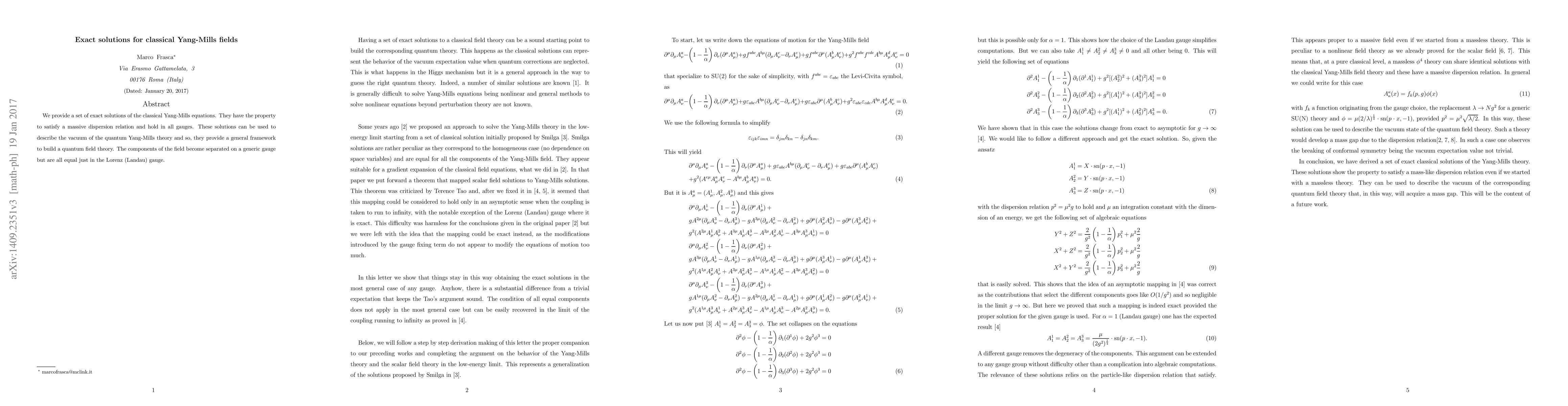 We provide a set of exact solutions of the classical Yang-Mills equations. They have the property to satisfy a massive dispersion relation and hold in all gauges. These solutions can be used to describe the vacuum of the quantum Yang-Mills theory and so, they provide a general framework to build a quantum field theory. The components of the field become separated on a generic gauge but are all equal just in the Lorenz (Landau) gauge.
